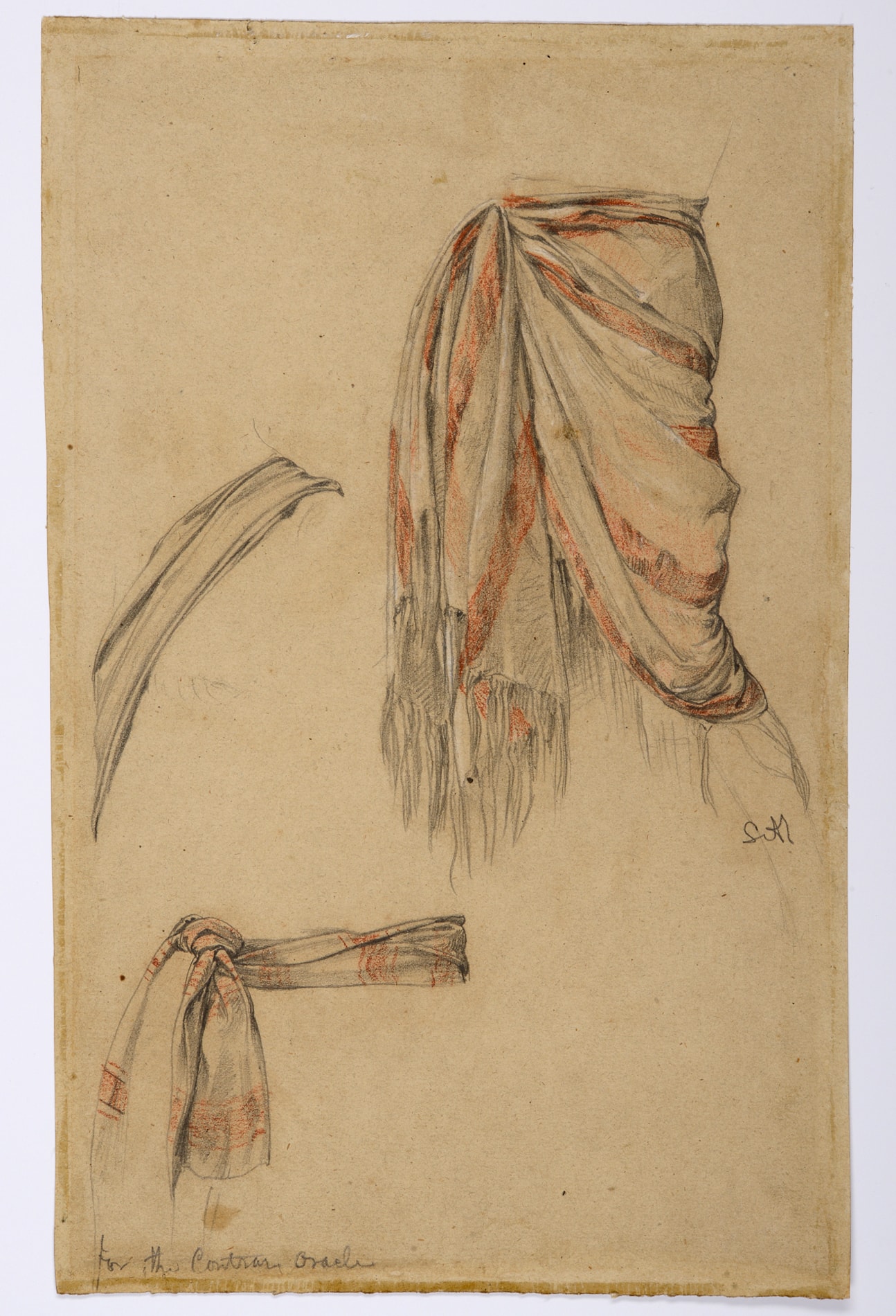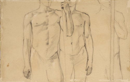 Vern Swanson has suggested that this drawing, part of a group of early drawings by Alma-Tadema, may be related to two paintings of Egyptian subjects, entitled Going to the Oracle and The Contrary Oracle, that the artist seems to have planned in 1857 and 1858, but which were either never executed, or else destroyed. (During his student years Alma-Tadema often destroyed or painted over paintings which he was unhappy with.) The studies of male nudes on the versos of this drawing provides a rare insight into Alma-Tadema’s working process. Such academic studies from the posed model indicate that, at least at this early stage in his career, the artist initially studied the figures in his compositions as nudes, before adding drapery.