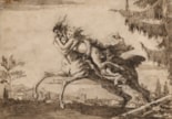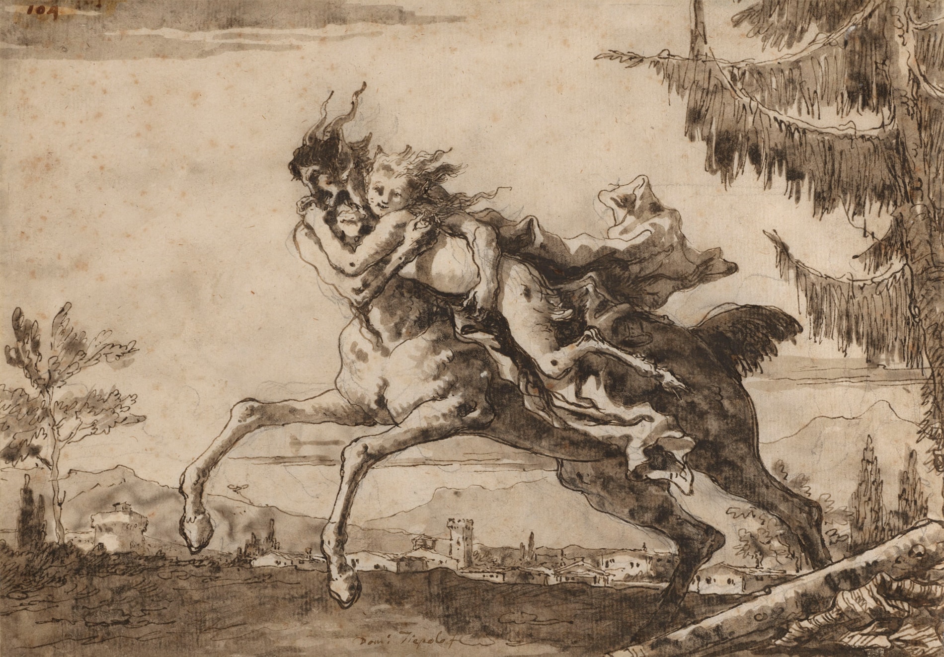 The largest proportion of Domenico Tiepolo’s drawings of centaurs, fauns and satyrs, numbering about thirty sheets, depict centaurs abducting nymphs or female fauns. Jean Cailleux has identified several of these drawings as depicting variations on the theme of Nessus and Dejanira, a subject taken from Greek mythology. (Dejanira, the wife of Hercules, was abducted by the centaur Nessus, who was later killed by Hercules with a poisoned arrow.) As Adelheid Gealt has noted, ‘Domenico, true to his era, chose to explore the lusty side of the centaur’s nature...He loved the action abductions provided, and, though never repeating himself, he considered abductions over and over again, indulging his fascination with theme and variation in scenes of animal passion, but including enough drama that the viewer can perceive a story embedded in each drawing.’ Similar depictions of centaurs abducting women appear in Domenico’s monochrome frieze decorations in fresco in the Palazzo Contarini dal Zaffo in Venice, painted in 1784, and in his frescoes for the Villa Tiepolo at Zianigo, now at the Ca’ Rezzonico in Venice.