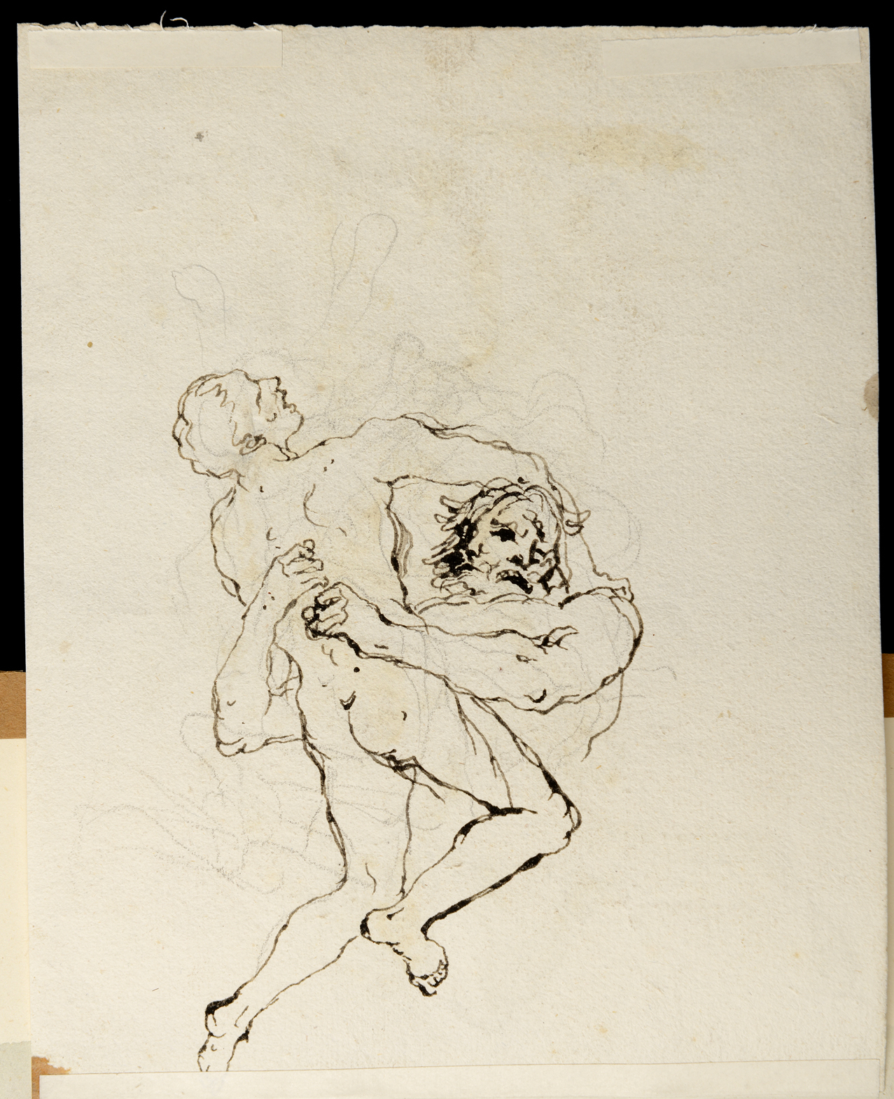 This series of drawings of Hercules and Antaeus by Domenico Tiepolo does not relate to any painting or fresco by the artist, and may instead be counted among the many pen and wash drawings – all variations on a theme – that the artist produced in the second half of his career. James Byam Shaw has suggested that this particular series of drawings may have been inspired by a drawing or print after a sculptural group of Hercules and Antaeus, such as a small bronze by the Renaissance sculptor Antico, known in several casts. It may also be noted that, early in his career, Domenico’s father Giambattista Tiepolo had painted a large canvas of Hercules and Antaeus for the salone of the Palazzo Sandi in Venice, executed between 1725 and 1726, and today in a private collection.