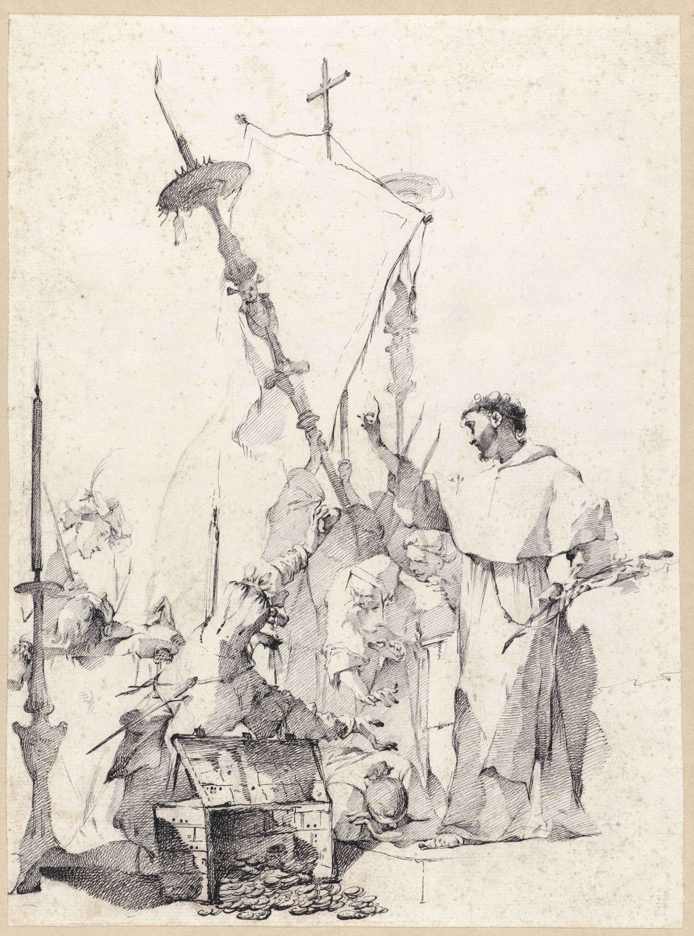 The subject of this large drawing is taken from an episode in the life of Saint Anthony of Padua. Preaching in Florence at the funeral of a wealthy moneylender and speaking to his audience of the sin of greed, Anthony claimed that the body of the miser should not be buried in consecrated ground, for his soul was already suffering in hell. He added that the man’s heart was no longer in his body, in keeping with the words of the Gospel of Saint Luke: ‘For where your treasure is, there your heart will be also.’ (12:34). The body of the miser was cut open and it was found that indeed his heart was not within him, but was instead discovered in the dead man’s treasure chest.