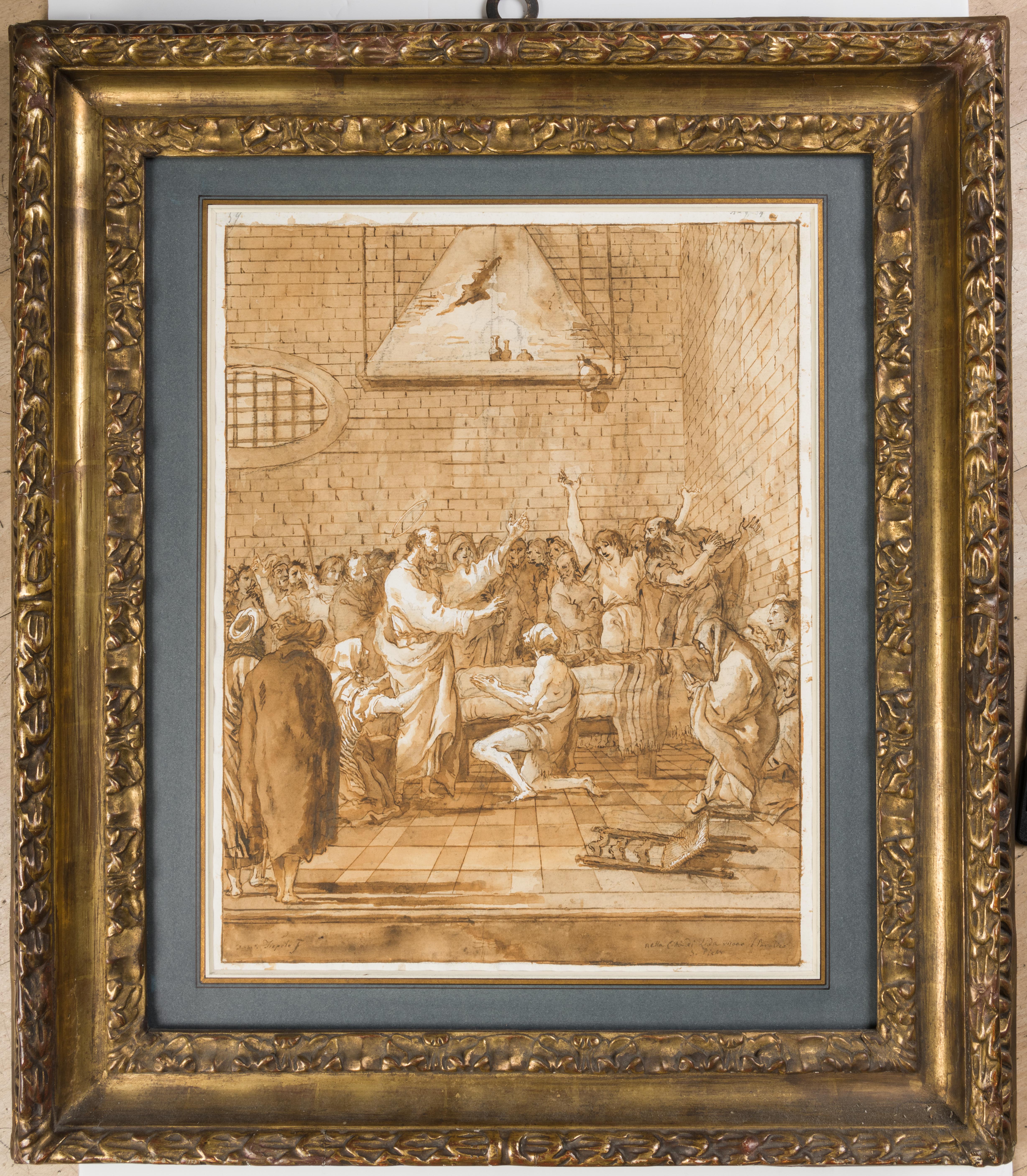 While most, but not all, of the three hundred and twenty known drawings from the ‘Large Biblical Series’ are signed by the artist, they are unnumbered and untitled. A few drawings, however, have long inscriptions, notably those - like the present sheet – which depict the Acts of Saint Peter. These inscriptions are always in Italian, and it has been suggested that, throughout the development of the ‘Large Biblical Series’, Domenico referred to a recent translation of the New Testament into vernacular Italian, probably that published in Turin in 1769 by Antonio Martini.