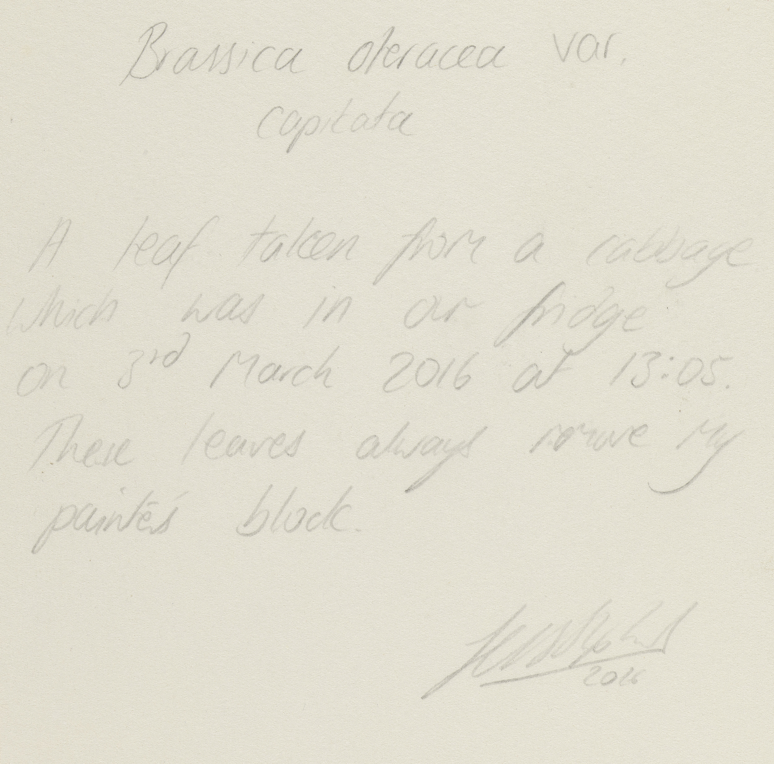 Further inscribed, signed and dated Brassica oleracea var. / capitata / A leaf taken from a cabbage / which was in our fridge / on 3rd March 2016 at 13:05. / These leaves always remove my / painters block. / Jess Shepherd / 2016 on the verso.