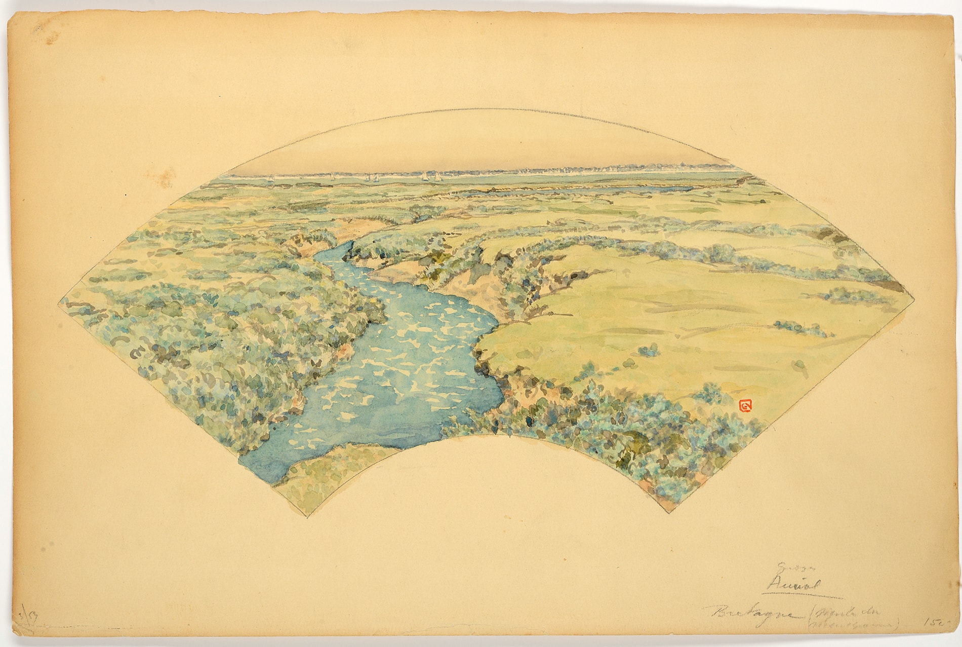 This view in Brittany is one of a handful of watercolours drawn by Auriol as designs for fans; indeed, at the time that his work was first exhibited, at the Société des Peintres-Graveurs in 1893, one of the works he showed was a woodcut of a design for a fan, made for the dramatist Charles Maurice Donnay.