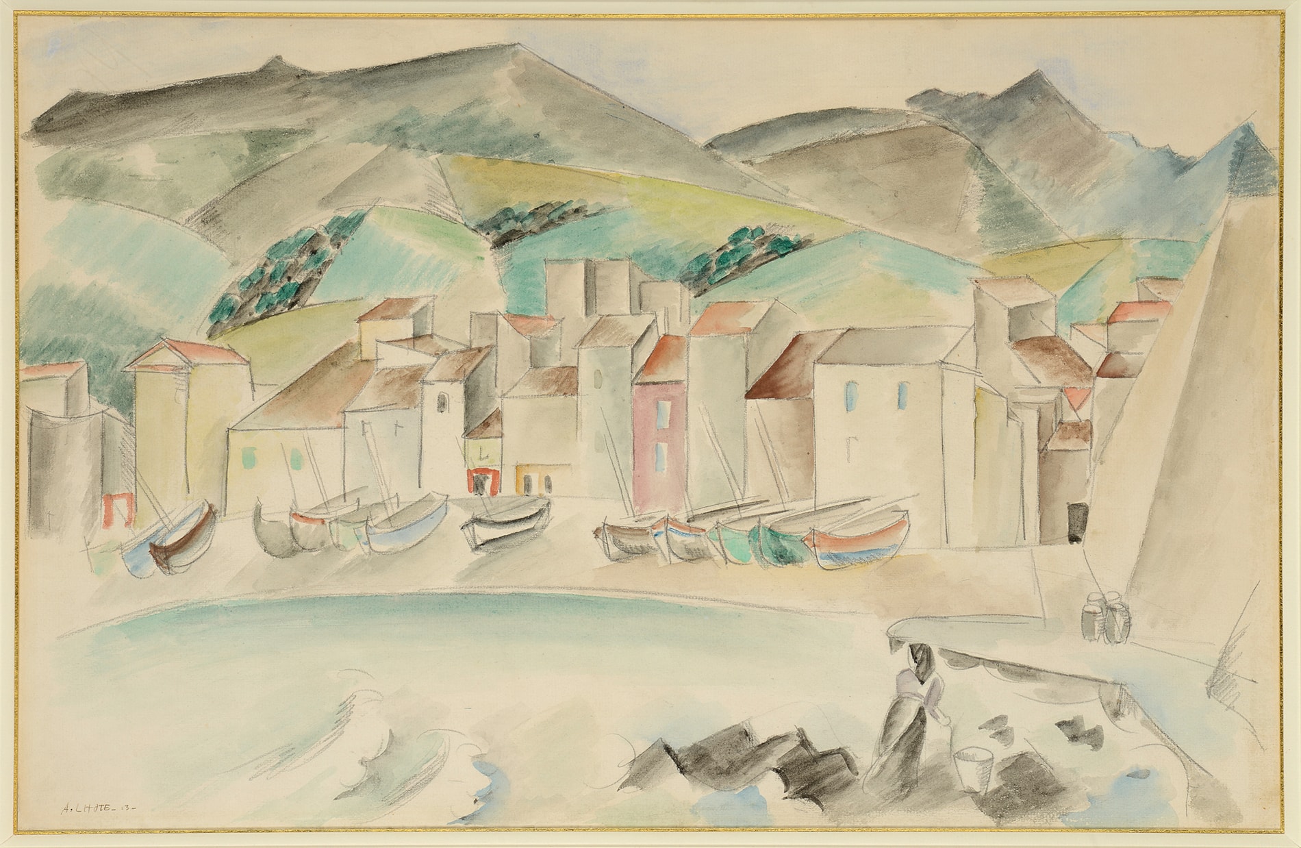 In the early part of the 20th century, the small Mediterranean port town of Collioure in France, very close to Spain, was a popular destination for artists such as Georges Braque, André Derain, Othon Friesz, Henri Martin, Paul Signac, Léopold Survage and, most notably, Henri Matisse. Lhote must have visited Collioure more than once, since he produced a handful of paintings of this picturesque Catalan fishing village, albeit each one different in composition from the present sheet. A painting of Collioure is in the Musée Fabre in Montpellier, while a different view of the port, dated 1917, was with the Marlborough Gallery in London in 1958 and was included in the Lhote retrospective exhibition in Paris that year. Another painting of Collioure by Lhote, datable to c.1920, was sold at auction in London in 1990.