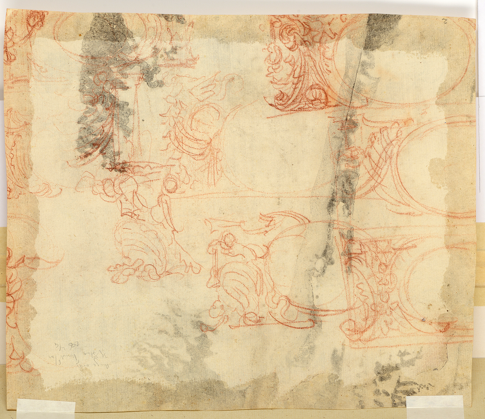 The present sheet may be compared to other drawings by Volterrano for decorative details and ornament, such as two sheets of studies for the design of a frame, sold alongside the present drawing at auction in London in 1980, and several of the drawings in the Kunstbibliothek in Berlin. The verso of the present sheet, drawn in red chalk, appears to show several designs for frames or cartouches, and may be compared with a drawing for an oval cartouche or frame which was on the art market in London in 2004 and is now in the collection of the National Gallery of Scotland in Edinburgh.