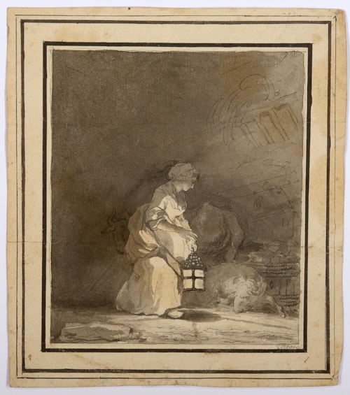 Pen and black and grey ink and grey wash, within a fictive drawn mount, with framing lines in black ink.