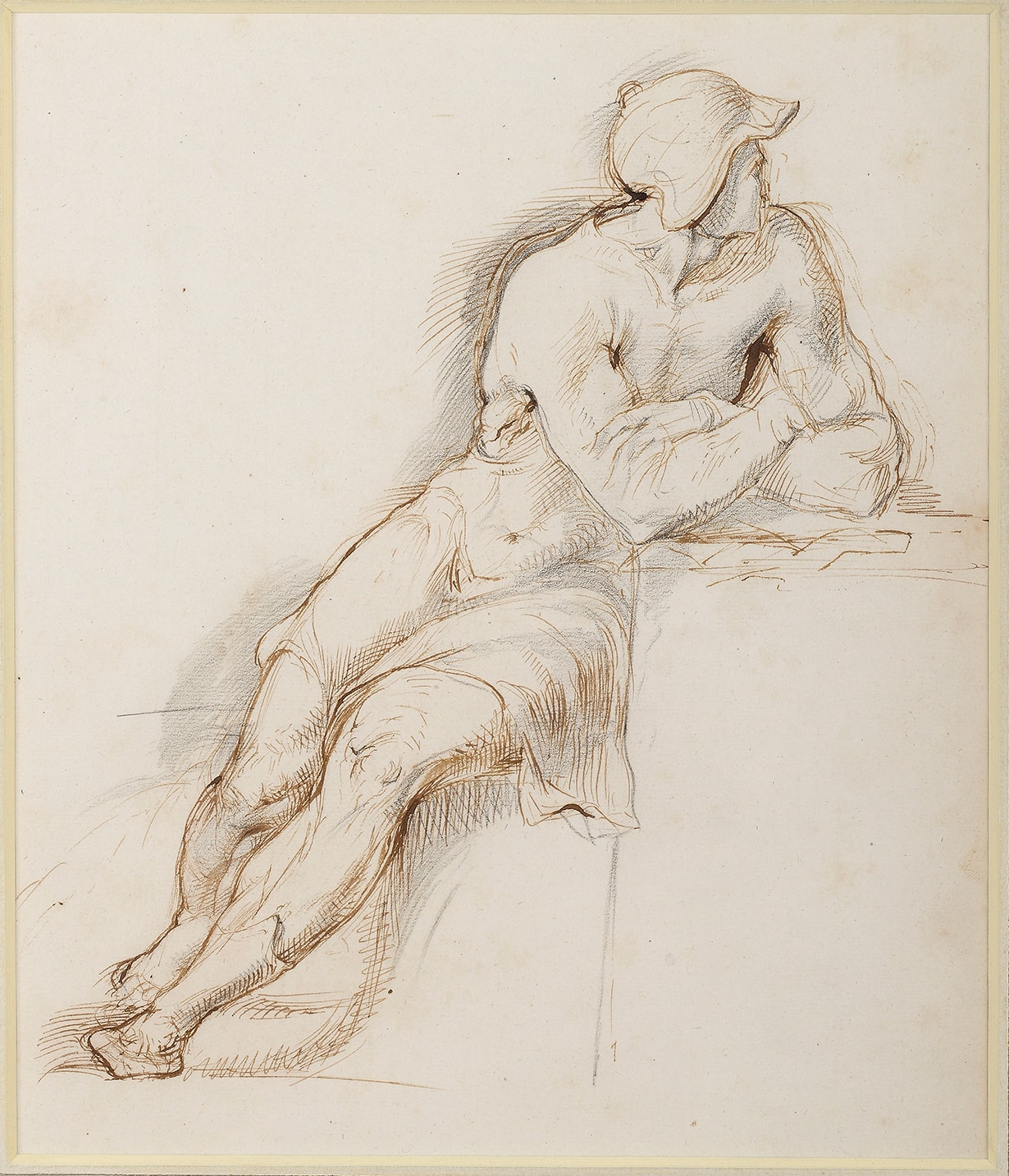 Most early drawings by Richmond have long remained in the possession of his descendants. This drawing, which depicts a man dressed as a soldier all’antica, may be likened to a pen and ink study of a seated man, sold at auction in 1977, that was once part of a sketchbook used by Richmond between 1824 and 1830. The present sheet may be dated to the same period, during which the artist studied under Henry Fuseli at the Royal Academy Schools, met the elderly William Blake, Samuel Palmer and Edward Calvert, joined ‘The Ancients’, and completed his training in Paris.