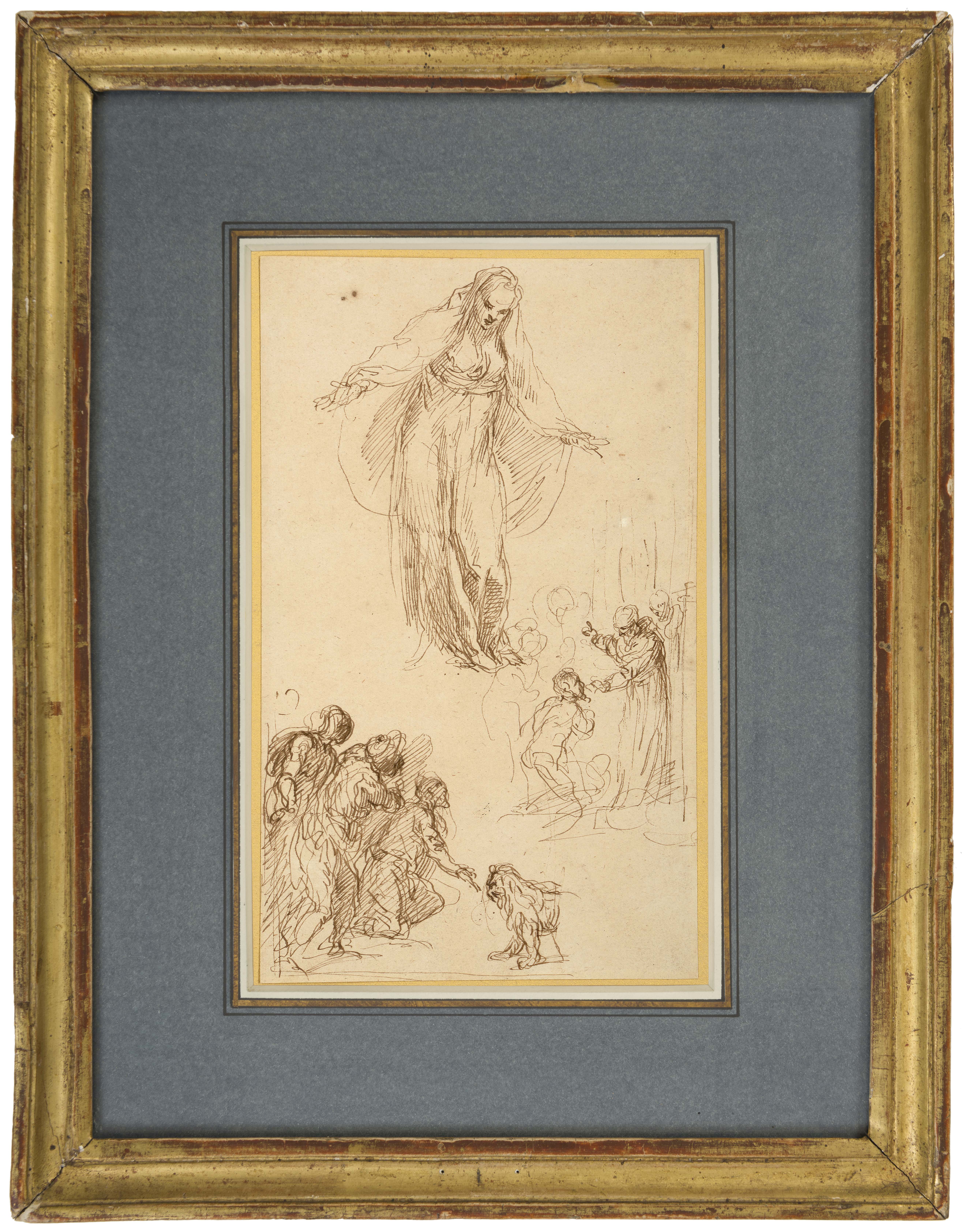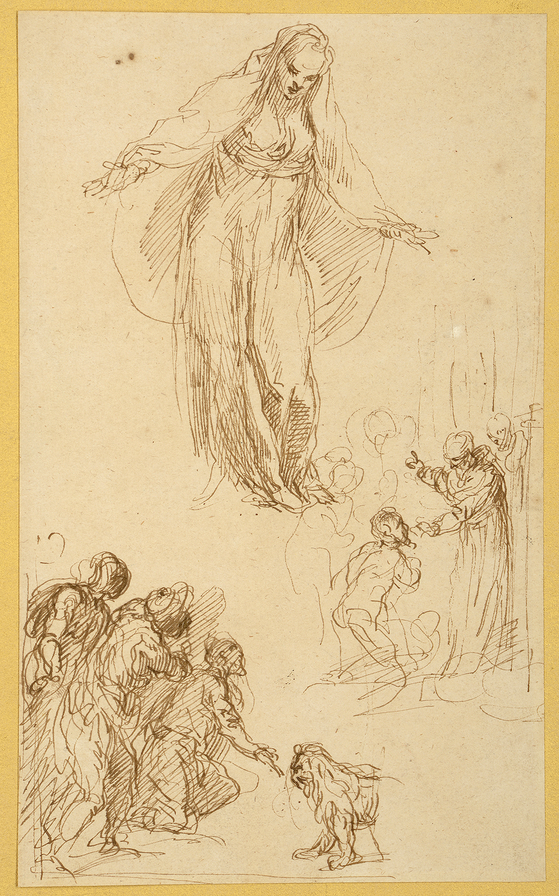 Although this drawing is a fine and typical example of Palma Giovane’s spirited draughtsmanship, none of the three separate studies on the sheet can be definitively related to any surviving painting or fresco by the artist. The figure of the Virgin (or a female saint) at the top of the sheet, for example, appears in a similar pose in several works by the artist, but in each case with significant differences from the figure in the drawing.