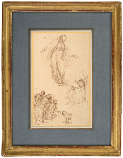 Although this drawing is a fine and typical example of Palma Giovane’s spirited draughtsmanship, none of the three separate studies on the sheet can be definitively related to any surviving painting or fresco by the artist. The figure of the Virgin (or a female saint) at the top of the sheet, for example, appears in a similar pose in several works by the artist, but in each case with significant differences from the figure in the drawing.