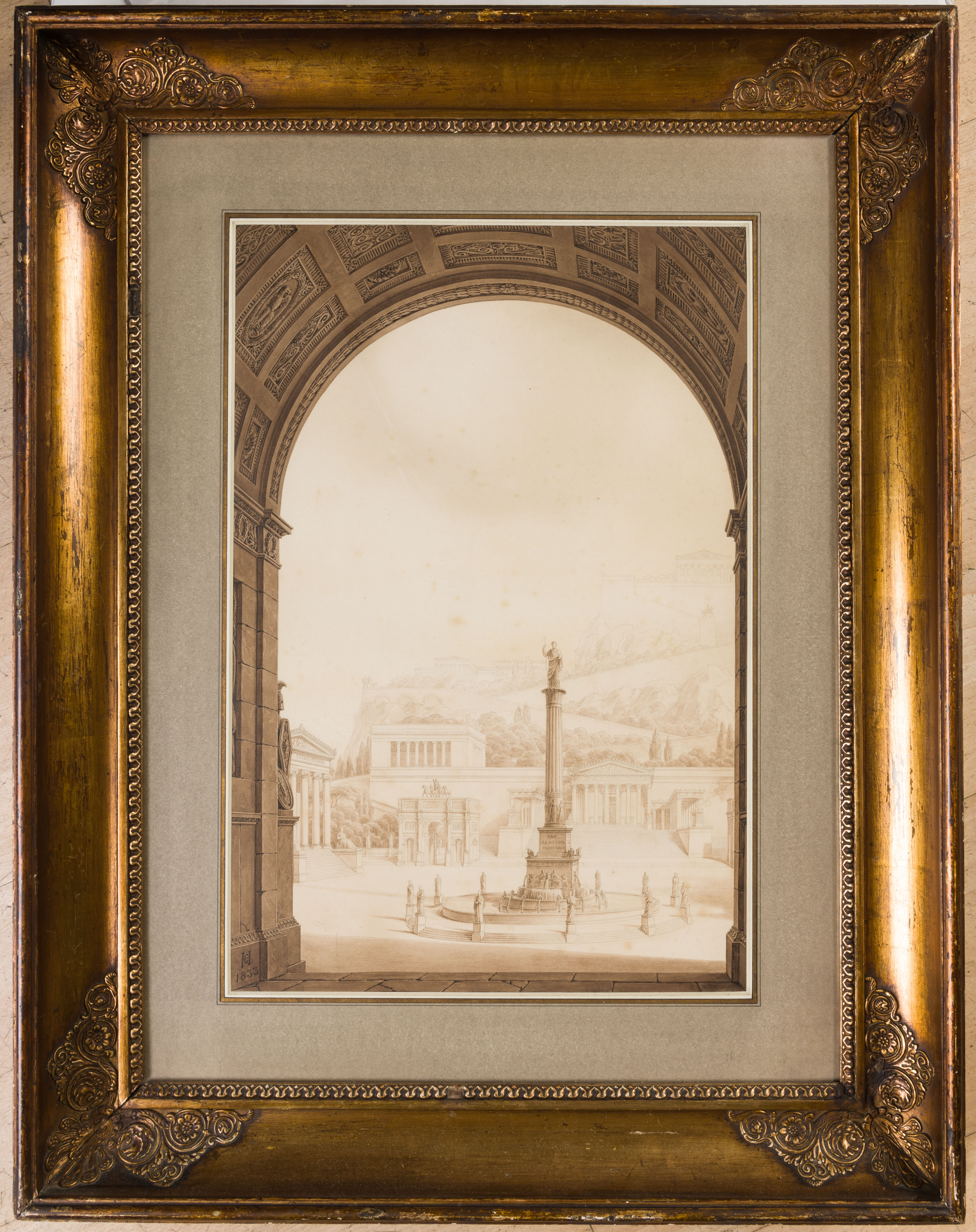 The present sheet can be likened to an ink and wash drawing of the imaginary perspectival interior of a classical building by Gustav Hetsch, signed and dated 1820, in the collection of the Kunstakademiets Bibliotek in Copenhagen. Intended as a design for a pantheon or temple devoted to famous men, the drawing was the artist's reception piece for admission into the Kunstakademie in Copenhagen, to which he was accepted in June 1820.