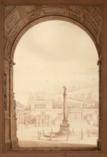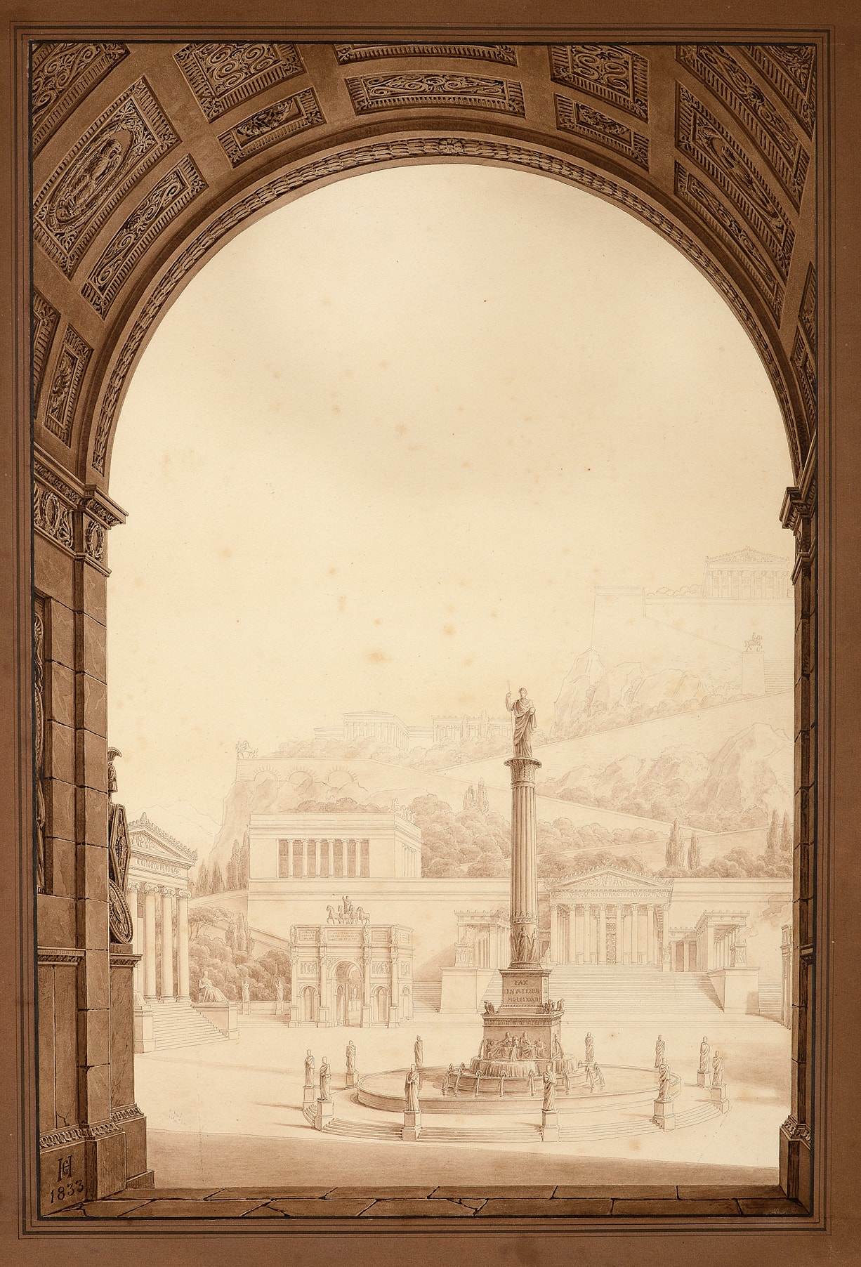 The present sheet can be likened to an ink and wash drawing of the imaginary perspectival interior of a classical building by Gustav Hetsch, signed and dated 1820, in the collection of the Kunstakademiets Bibliotek in Copenhagen. Intended as a design for a pantheon or temple devoted to famous men, the drawing was the artist's reception piece for admission into the Kunstakademie in Copenhagen, to which he was accepted in June 1820.