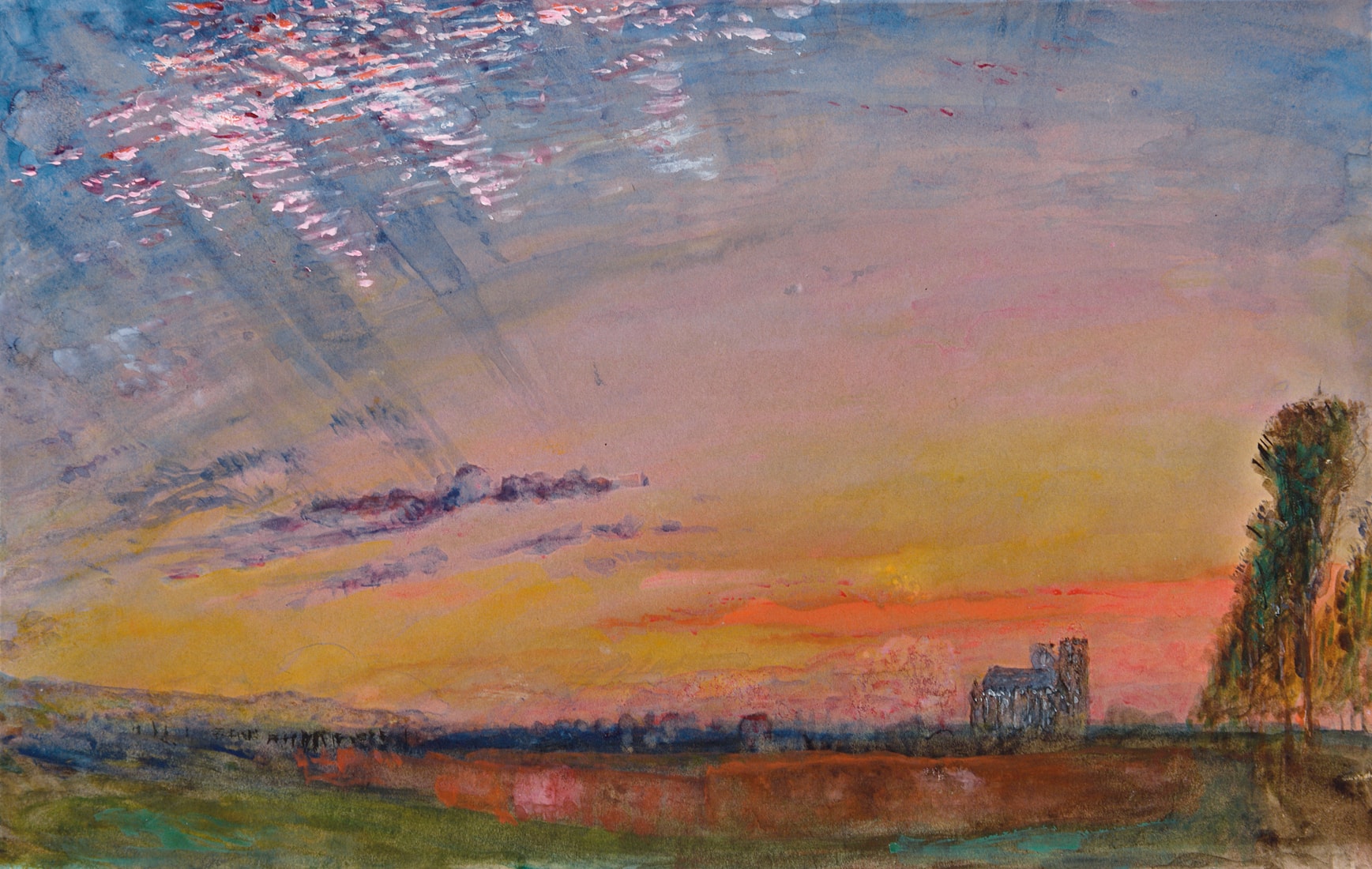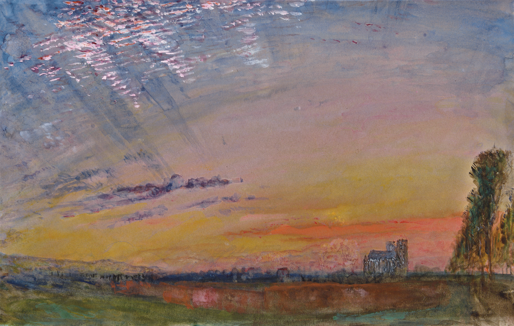 The present sheet may be likened to a number of stylistically comparable watercolour studies of skies at dawn or sunset by Ruskin. Particularly close to this Abbeville watercolour, in both subject and technique, is a view of Beauvais Cathedral, Light in the West in the Ruskin Library at Lancaster University, which shares with the present sheet a dramatic and vibrant depiction of the sunset above the cathedral. The Beauvais watercolour was later engraved for Vol.V of Modern Painters, alongside Ruskin's detailed description of its dramatic sky, which underscores his abiding interest in capturing such light effects: '[this] is a sketch of an actual sunset behind Beauvais cathedral (the point of the roof of the apse, a little to the left of the centre, shows it to be a summer sunset), the white cirri in the high light are all moving eastward, away from the sun, in perfectly parallel lines, curving a little round to the south. Underneath, are two straight ranks of rainy cirri, crossing each other; one directed south-east; the other north-west. The meeting perspective of these, in extreme distance, determines the shape of the angular light which open above the cathedral. Underneath all, fragments of true rain-cloud are floating between us and the sun, governed by curves of their own. They are, nevertheless, connected with the straight cirri by the dark semi-cumulus in the middle of the shade above the cathedral.'