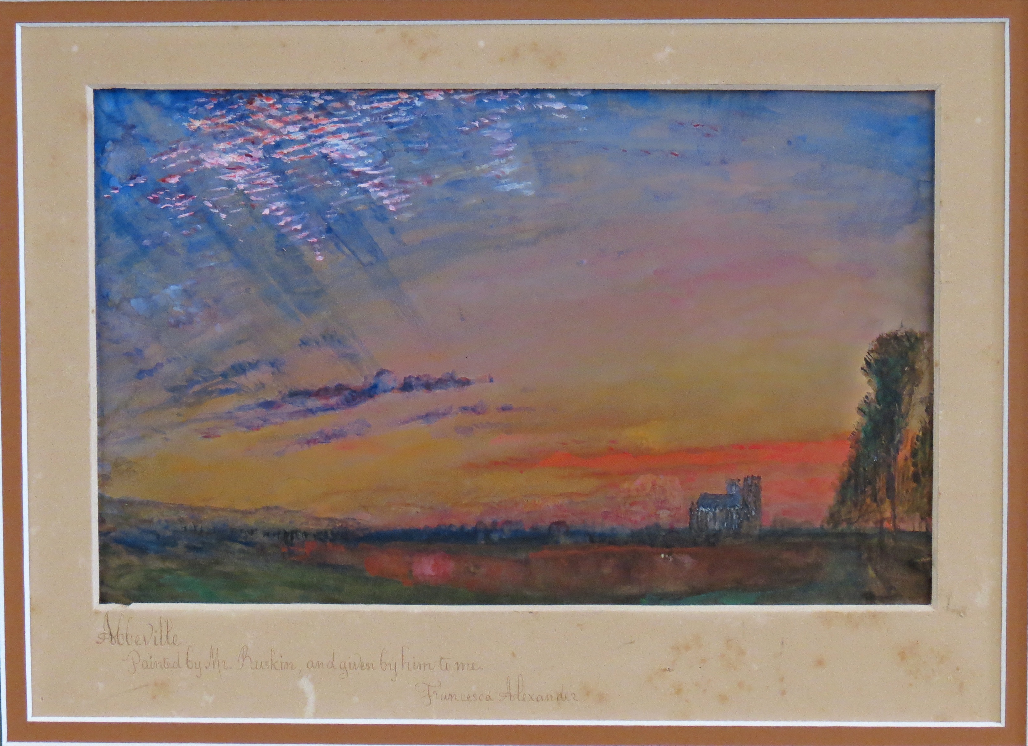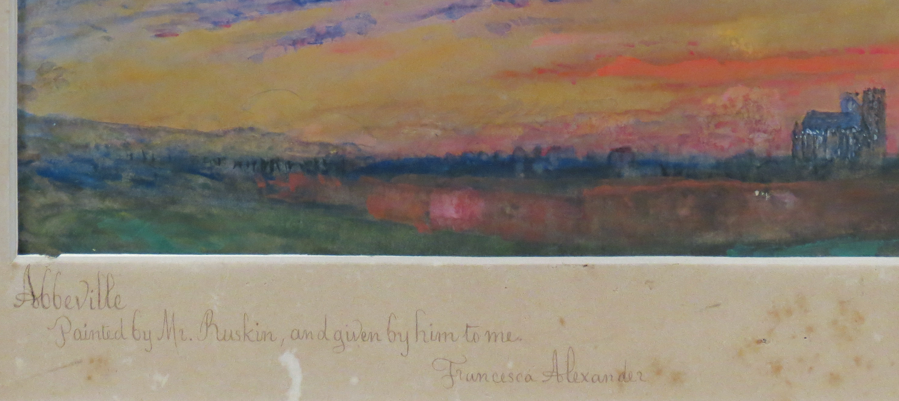 This striking watercolour of a sunset above the northern French town of Abbeville is a new and previously unknown addition to Ruskin's oeuvre as a draughtsman. Ruskin visited Abbeville several times in his life, and it was among his favourite towns in France. He stayed there for the first time when travelling with his parents in June 1835, and was enchanted by the unspoiled architecture of the town, and in particular the Late Gothic church of St. Wulfran. He returned for a few days on his honeymoon in 1848, and again twenty years later, in 1868, when he spent nearly two months in Abbeville, making a number of drawings of the town and its buildings, as well as the surrounding countryside. He returned to Abbeville for three days in the summer of 1880, during a period of several weeks spent in northern France that would eventually result in his book The Bible of Amiens. Ruskin made a final visit to Abbeville in June 1888, during his last trip to France when, accompanied by his friend, the painter Arthur Severn, he spent about a month there.