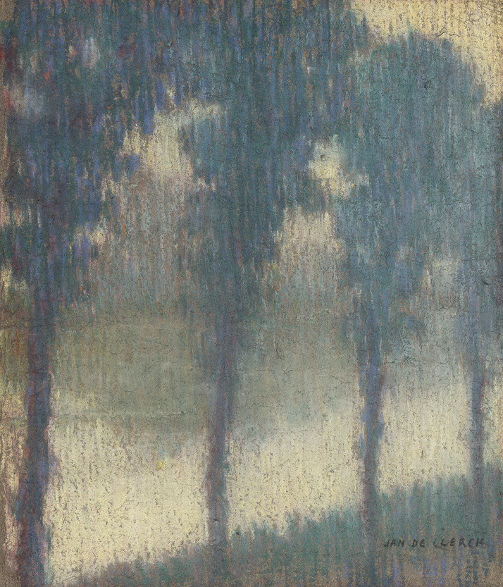 Drawn on felt, the present pastel is an early work datable to c.1905-1906. De Clerck's paintings were often admired for their atmospheric properties; as the contemporary art critic Maurice de Praetere wrote, 'M. De Clerck applies a particular technique: the stillness in his paintings is potential motion, it is dynamic repose. He lets peace and quiet sink down in threads, like the upright, slow drops of a quiet summer rain. It is as if an atmospheric screen were slowly sinking on a stage from which the last actor has silently slipped away.' Stylistically comparable pastel landscapes painted on felt include Sous-bois and Street in Ostend of 1904 and Soirée poetique (Poetical Evening) of 1906, all of which are in private collections.