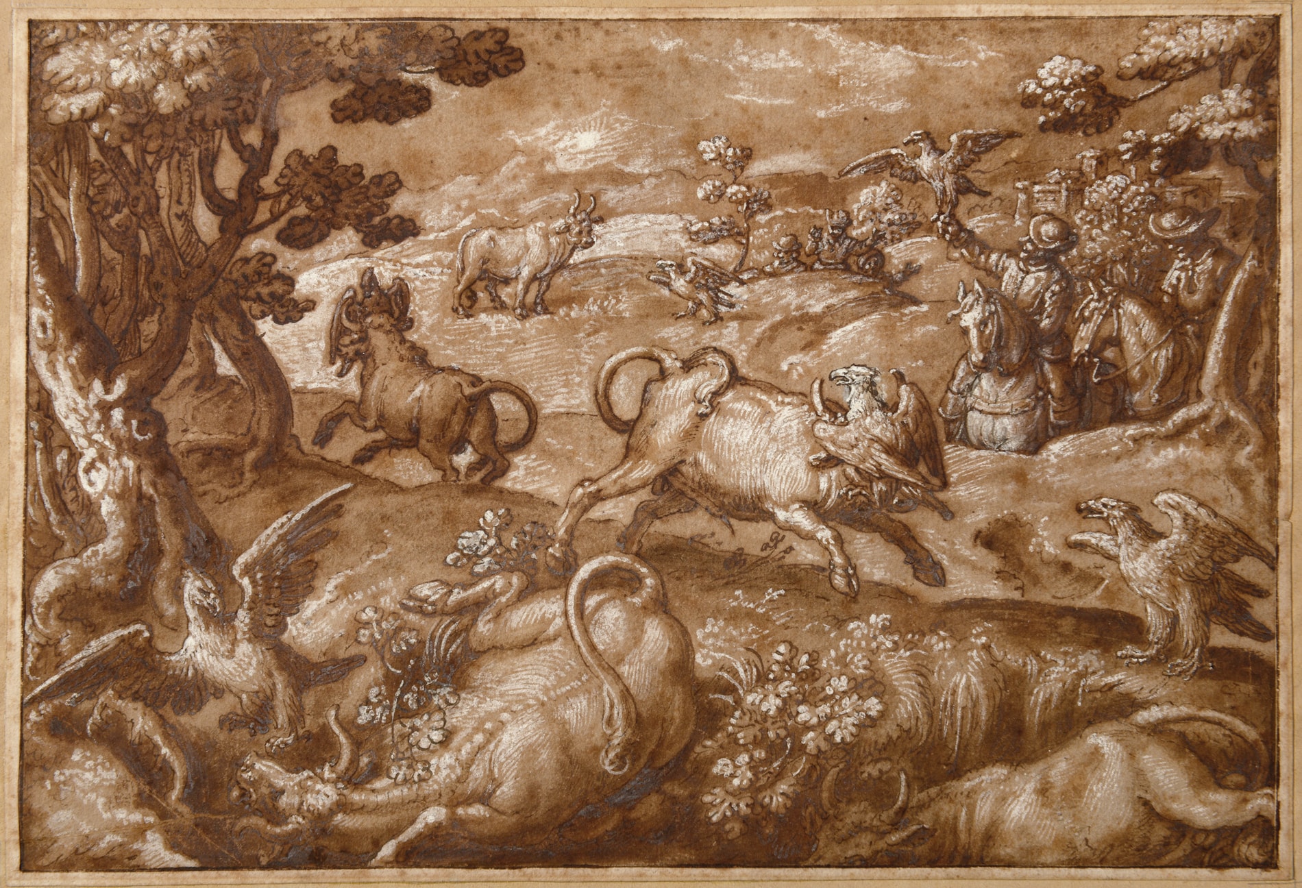 A small, rapidly sketched preparatory study by Stradanus for this composition appears on the lower half of a drawing of two bull hunts in the Cooper-Hewitt, Smithsonian Design Museum in New York; one of a large group of small-scale compositional sketches by the artist in the museum's collection.