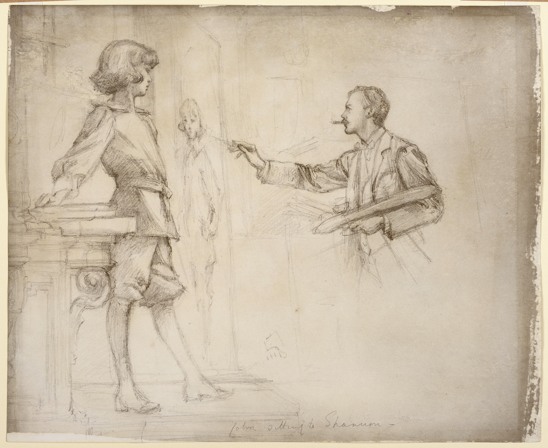 This drawing depicts the artist's young son John Manners being painted by the Anglo-American artist James Jebusa Shannon (1862-1923), one of the leading society portrait painters in London, at his studio in Holland Park in 1897. The second son of the Marquess and Marchioness of Granby, John Henry Montagu Manners, Lord Roos (1886-1940) was ten or eleven years old at the time this drawing was made. His elder brother Robert, Lord Haddon, had died three years earlier, at the age of nine, and John was the heir to the dukedom.