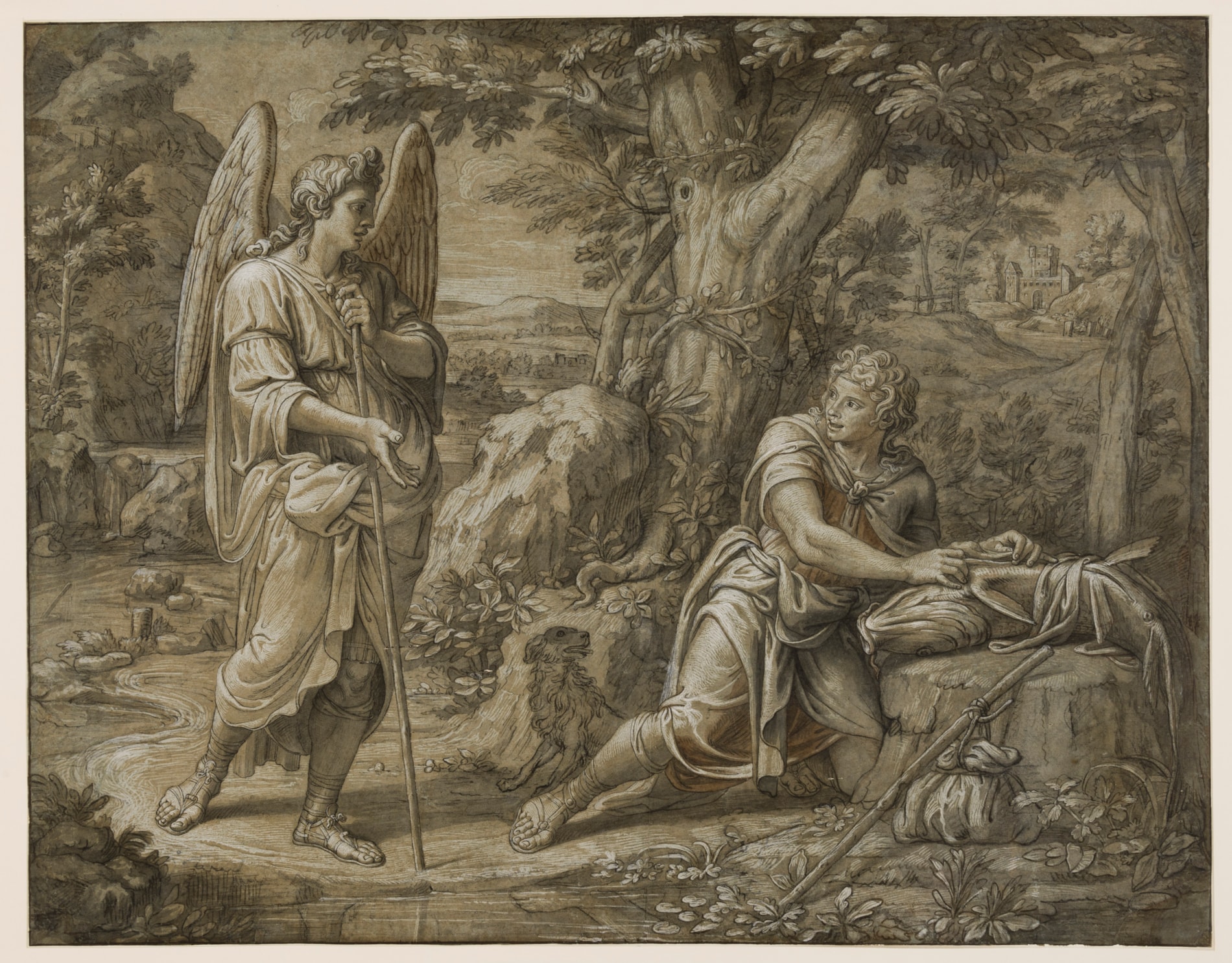 Pen and brown ink and two shades of brown wash, extensively heightened with white, over an underdrawing in black chalk, on blue paper, backed.