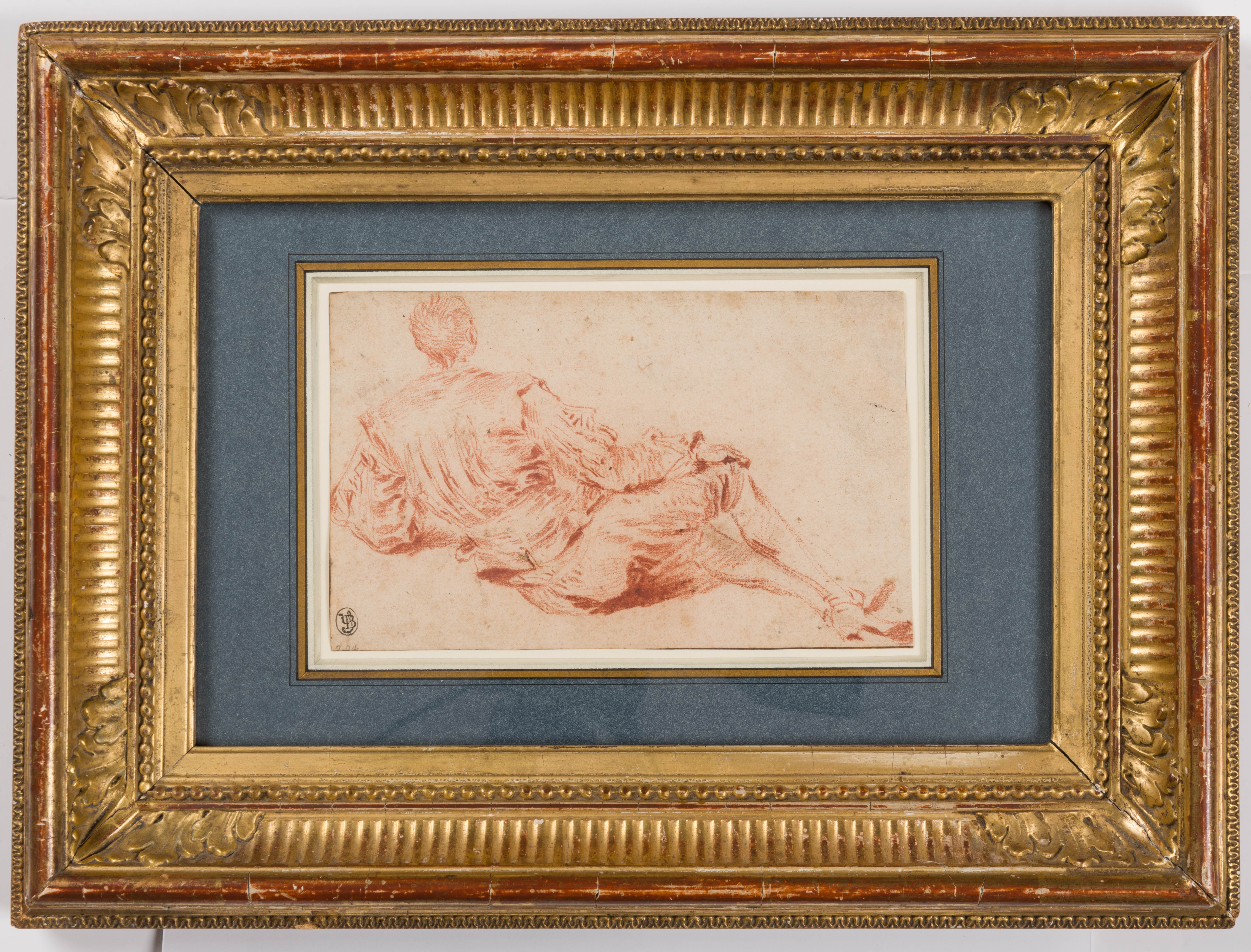 His sale, Paris, Galerie Georges Petit, 13-15 March 1905, part of lot 277 (as Watteau: Études de Mezzetins…L’un presque couché, vu de dos, accoudé à terre, une main appuyée sur le genou droit. L’autre, assis, vu de dos, la tête retournée de profil à gauche, un bras tendu. Deux dessins à la sanguine. Haut., 11 cent.; larg., l’un 17 cent, l’autre 19 cent. Cadre en bois sculpté.)