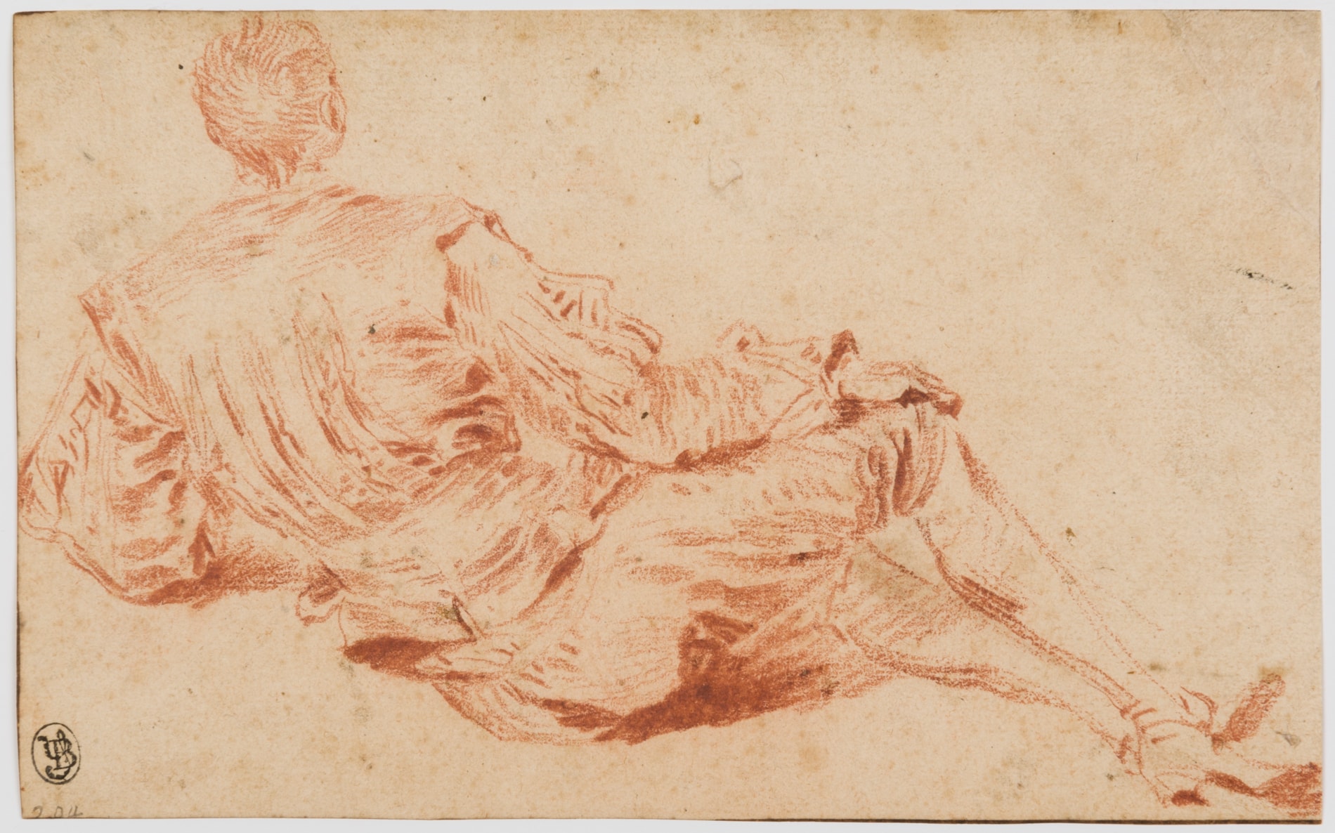 At the time of the 1905 Beurdeley sale, the present sheet was thought to be by Watteau, and was sold together with a related red chalk drawing of a reclining man, also at the time attributed to Watteau but in fact by Pater. This second drawing from the Beurdeley collection is a study for a figure in Pater’s painting Le Joeur de Lute of c.1720-1725 at Sanssoucci, and is stylistically akin to the present sheet. A similar red chalk drawing by Pater of a reclining man seen from behind, which appeared at auction in London in 1971, has been tentatively related to the Worcester painting.