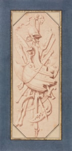 Four other preparatory drawings by Dumont le Romain for this set of engravings are known, all in red chalk and closely comparable to this pair of drawings. A red chalk design for a trophy of musical instruments, signed and dated 1736, is in the Ecole des Beaux-Arts in Paris, while another similar drawing of a trophy with attributes of the arts, also signed and dated 1736, is in the Kunstbibliothek in Berlin. Two further drawings of trophies by Dumont for the Livre de nouveaux trophées, formerly in the Beurdeley collection, are today in the Hermitage in Saint Petersburg.