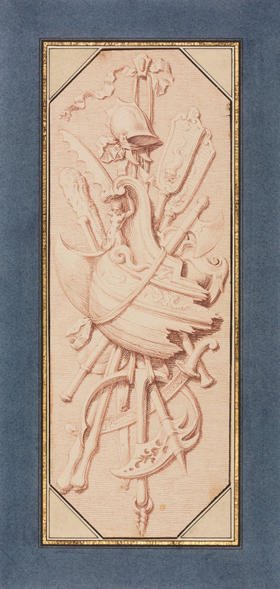As Peter Fuhring has noted of these designs for trophies, ‘Dumont le Romain adopted the thematic choices of Renaissance engravers such as Enea Vico, who were influenced by the rediscovery of the trophies of Antiquity. He successively represented motifs taken from the fine arts, music, the religious domain, Roman antiquity, navigation, Ottoman art, arms and armour – thus proposing a great variety of models which became very fashionable at that time.’