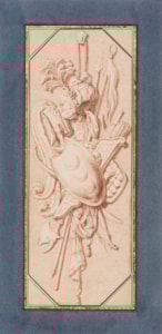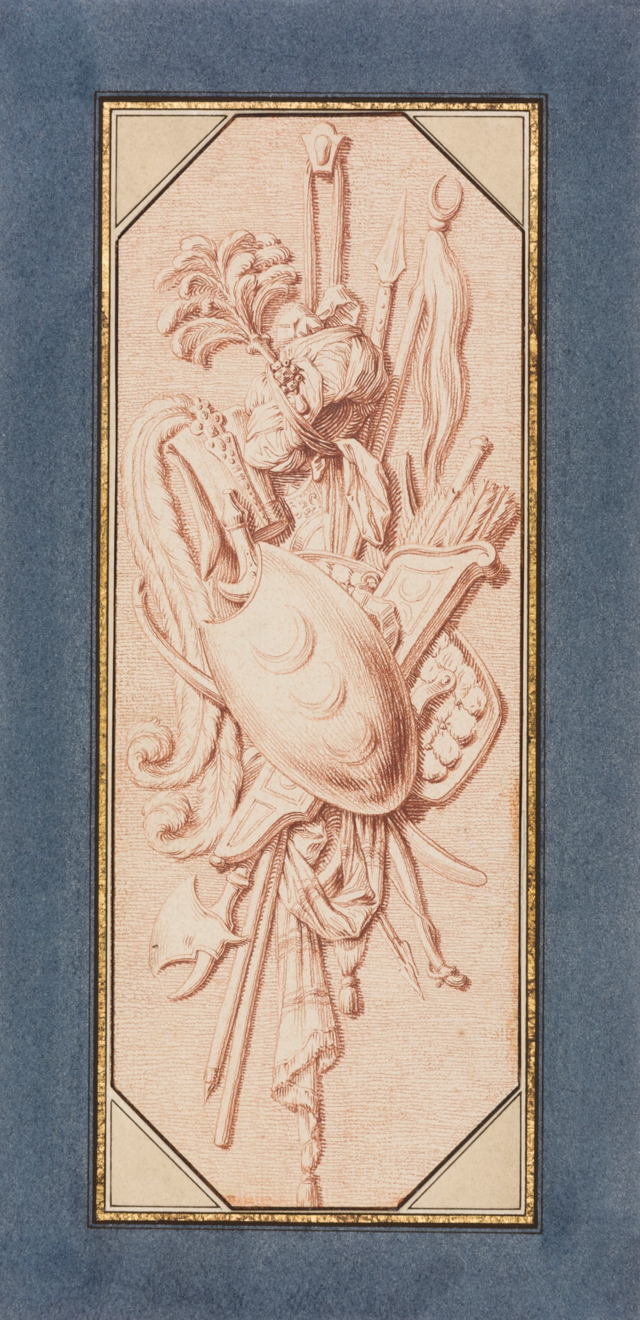 Four other preparatory drawings by Dumont le Romain for this set of engravings are known, all in red chalk and closely comparable to this pair of drawings. A red chalk design for a trophy of musical instruments, signed and dated 1736, is in the collection of the Ecole des Beaux-Arts in Paris, while another similar drawing of a trophy with attributes of the arts, also signed and dated 1736, is in the Kunstbibliothek in Berlin. Two further drawings of trophies by Dumont for the Livre de nouveaux trophées, formerly in the Beurdeley collection, are today in the Hermitage in Saint Petersburg.
