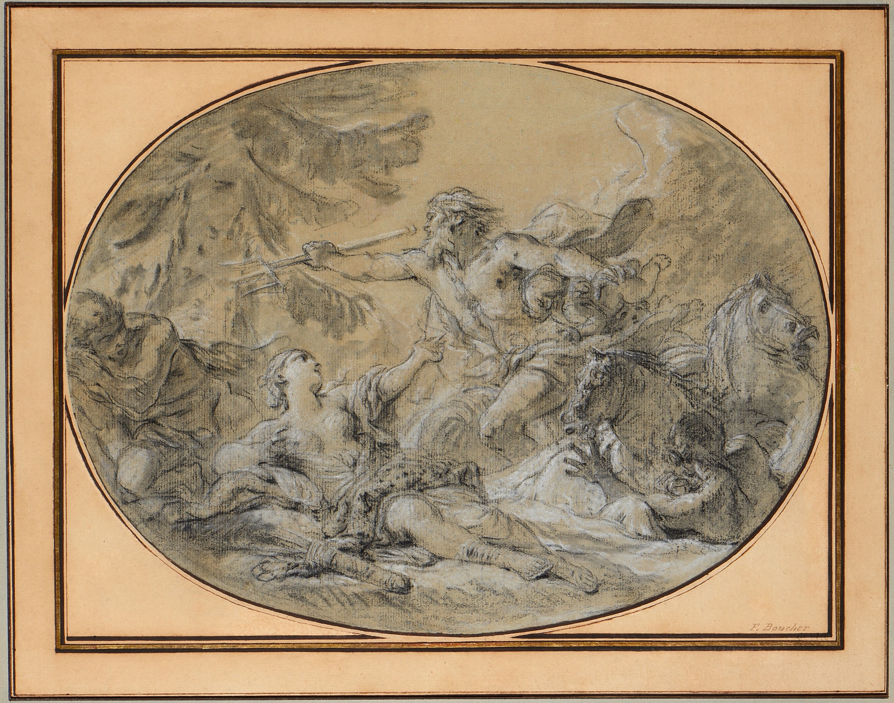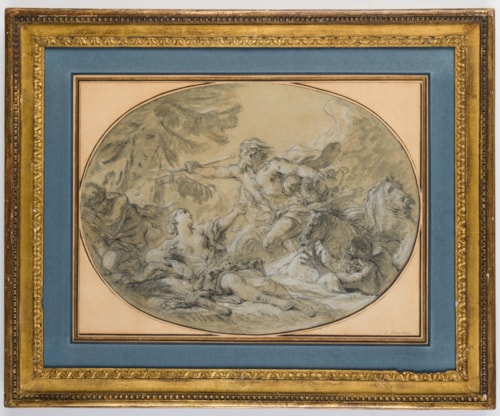 Boucher kept a studio at the Gobelins tapestry factory from 1749, and between 1755 and 1765 served as surinspecteurat the manufactory. He produced a number of paintings to be copied as tapestries at the Gobelins, the most significant of which to survive are the Tentures de Boucher. As Laing has noted, ‘Right up to the end of his life Boucher was producing paintings – not always of mythological subjects – for successive sets of the Tentures de Boucher, almost all of which were commissioned by grand foreign – and particularly English – clients; and this was continued after his death, based upon paintings that he had left behind. They were amongst the most successful sets of tapestries ever woven at the Gobelins.’ Related to the central medallion of the tapestry of Neptune Rescuing Amymone, the present sheet, which may be dated to 1764, depicts the sea god Neptune, armed with his trident, leaping from his horse-drawn chariot to save Amymone from the ravages of a satyr.