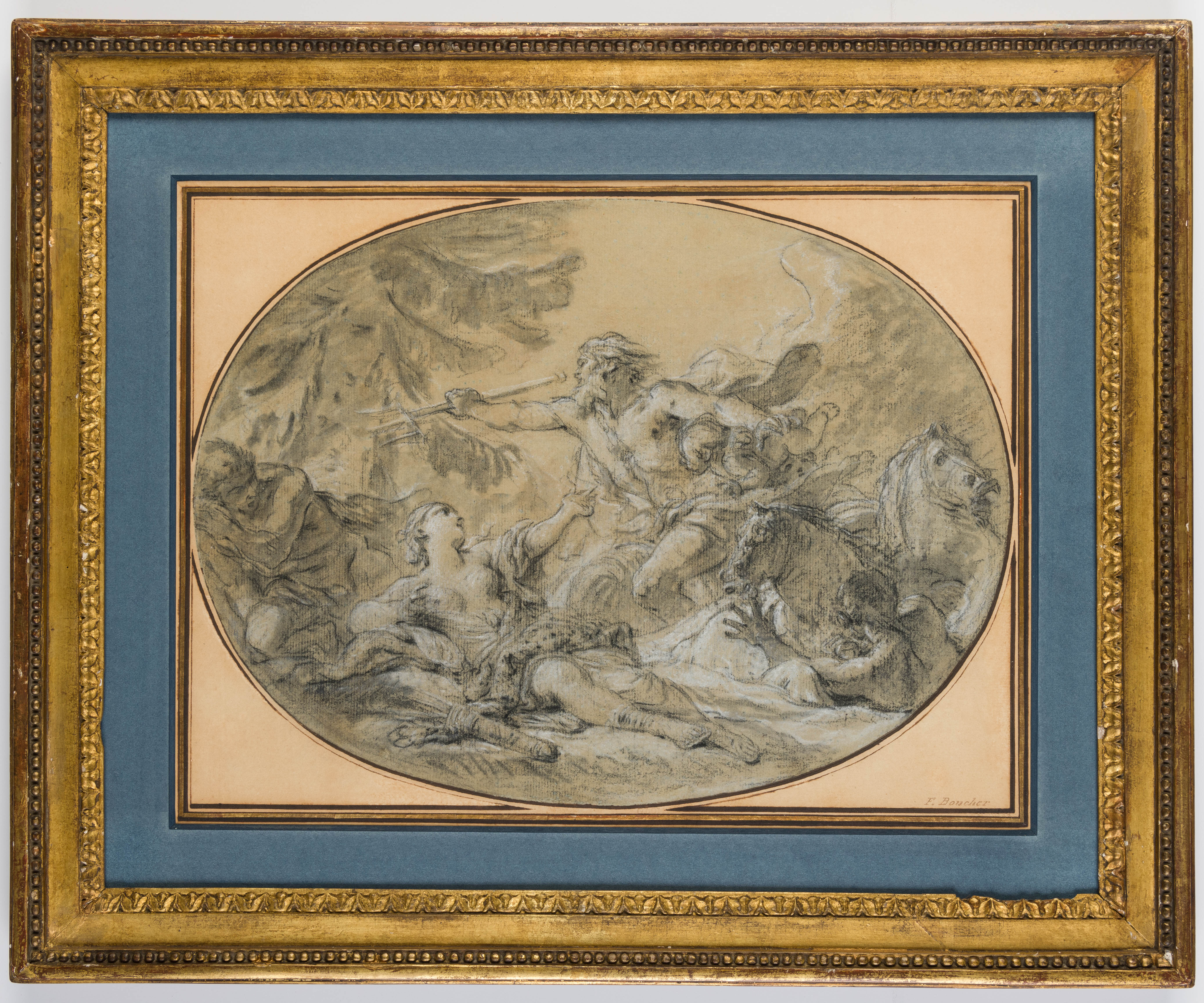 A gifted draughtsman, François Boucher was as prolific as he was talented, and claimed to have produced ten thousand drawings over a career that lasted some fifty years. He was, in fact, perhaps the most prolific French draughtsman of the eighteenth century, and his drawn oeuvre includes pastoral scenes, nudes, religious, historical and mythological subjects, book illustrations, chinoiseries, landscapes, genre scenes, studies of children and heads, as well as designs for tapestries, porcelain and fountains. Although most of his drawings were preparatory studies for his paintings, Boucher also produced finished drawings as independent works, often adapting and elaborating a head or figure from one of his paintings. While his preference was for black, red, and (particularly in his later years) a dark brown chalk, he also made highly finished drawings in pastel and, at times, drew on coloured paper. As Pierre Rosenberg has succinctly noted, ‘Boucher’s love of drawing never waned with time and success. Admittedly, drawing was kept in its proper place, as a vital link between the conception or the idea of a work or composition, and its realization, its metamorphosis into a painting…To quote Mariette, Boucher “was a born painter”, but he placed great emphasis on drawing throughout his entire career.’ Boucher’s drawings were avidly collected in his lifetime by such connoisseurs as Barthelémy-Augustin Blondel d’Azaincourt, Paul Randon de Boisset, Pierre-Jacques-Onésyme Bergeret de Grancourt, Gilbert Paignon-Dijonval, Jean-Claude Gaspard de Sireuil, Count Carl Gustaf Tessin, and many others.