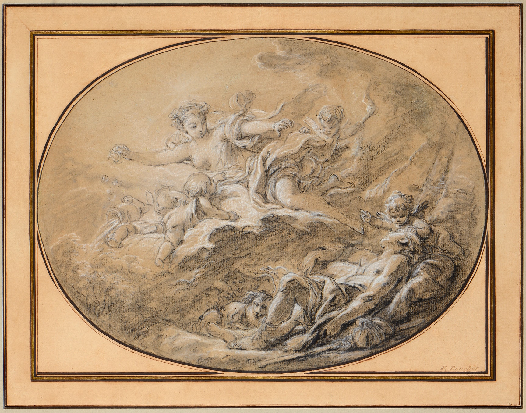 Both this and the previous drawing have been dated by Alastair Laing to the 1760s. However, as he has noted, ‘It seems most likely that that of Neptune & Amymone was done in 1764, but that that of Aurora and Cephalus was done at a slightly different time – whenever it was that a transverse oval version of the upright oval version of it was painted by Boucher or contemplated…there are differences between the two in the colour both of the papers and of the chalks used on them. This would further suggest that they were genuinely designs for the paintings that served as models for the tapestries, and that they were submitted at different times…to the marquis de Marigny for his approval, who then held onto them. This is particularly likely to have been so, since – unlike in the case of some other designs for tapestries by Boucher - there is no evidence of there ever having been any oil sketches for them or for any of the other compositions used in the Tentures de Boucher...Were they to have been drawn from the paintings, just as gifts for Marigny, in gratitude for the commission, one would have expected the two to have been treated in exactly the same way.’