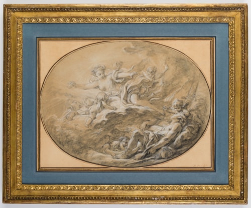 A gifted draughtsman, François Boucher was as prolific as he was talented, and claimed to have produced ten thousand drawings over a career that lasted some fifty years. He was, in fact, perhaps the most prolific French draughtsman of the eighteenth century, and his drawn oeuvre includes pastoral scenes, nudes, religious, historical and mythological subjects, book illustrations, chinoiseries, landscapes, genre scenes, studies of children and heads, as well as designs for tapestries, porcelain and fountains. Although most of his drawings were preparatory studies for his paintings, Boucher also produced finished drawings as independent works, often adapting and elaborating a head or figure from one of his paintings. While his preference was for black, red, and (particularly in his later years) a dark brown chalk, he also made highly finished drawings in pastel and, at times, drew on coloured paper. As Pierre Rosenberg has succinctly noted, ‘Boucher’s love of drawing never waned with time and success. Admittedly, drawing was kept in its proper place, as a vital link between the conception or the idea of a work or composition, and its realization, its metamorphosis into a painting…To quote Mariette, Boucher “was a born painter”, but he placed great emphasis on drawing throughout his entire career.’ Boucher’s drawings were avidly collected in his lifetime by such connoisseurs as Barthelémy-Augustin Blondel d’Azaincourt, Paul Randon de Boisset, Pierre-Jacques-Onésyme Bergeret de Grancourt, Gilbert Paignon-Dijonval, Jean-Claude Gaspard de Sireuil, Count Carl Gustaf Tessin, and many others.