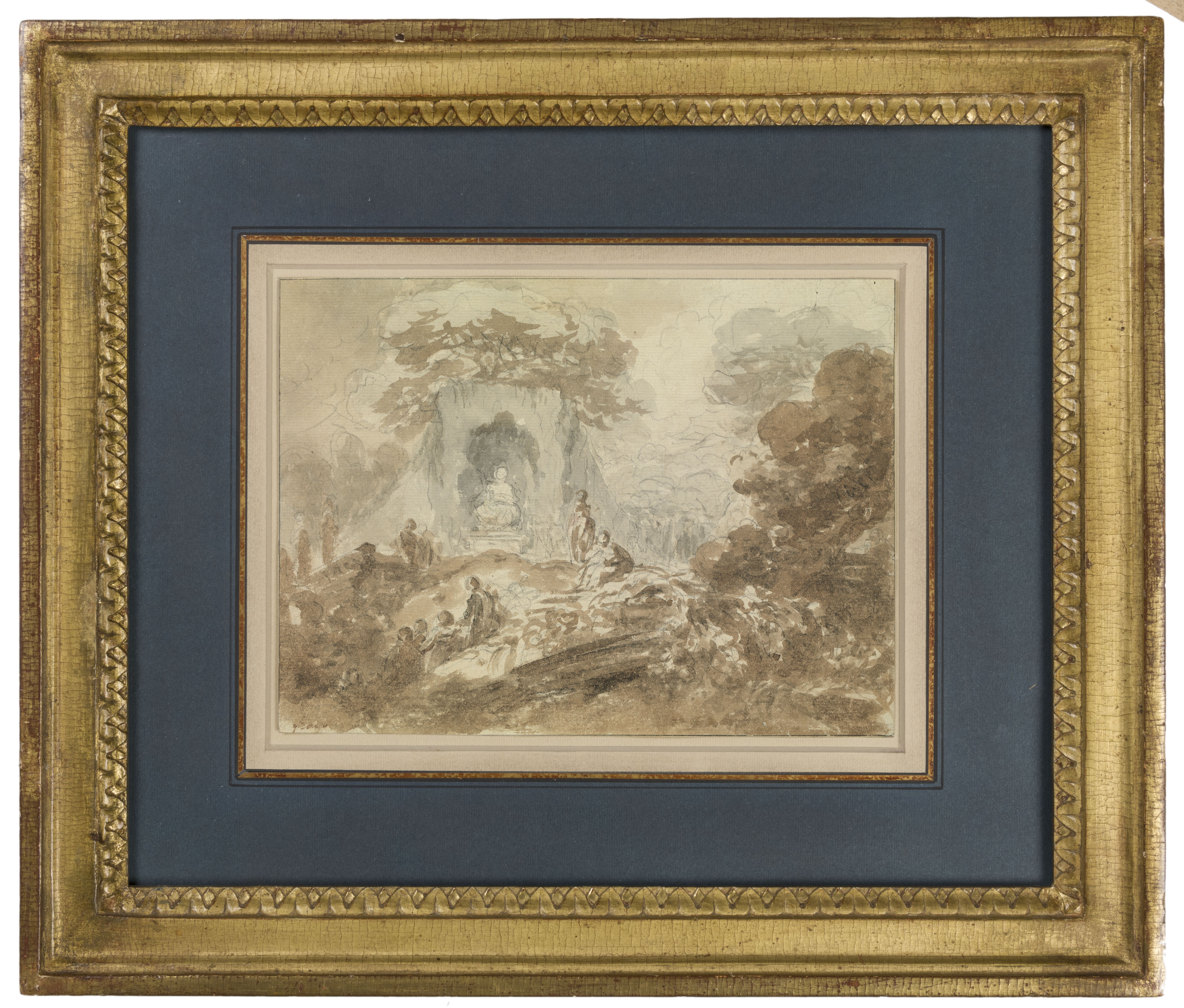 Drawn with incredible freedom in brush and wash, this atmospheric landscape drawing is likely to have been made during or shortly after Fragonard’s summer at Tivoli in 1760. As one scholar has described the drawing, ‘The shadowy, diffuse figures in the foreground seem to be worshipping, or at least contemplating, the statue of a female figure set on a pedestal in a niche or grotto. The latter is placed at the end of a vaguely defined structure, natural or man-made, which compounds the enigmatic quality of the scene.’
