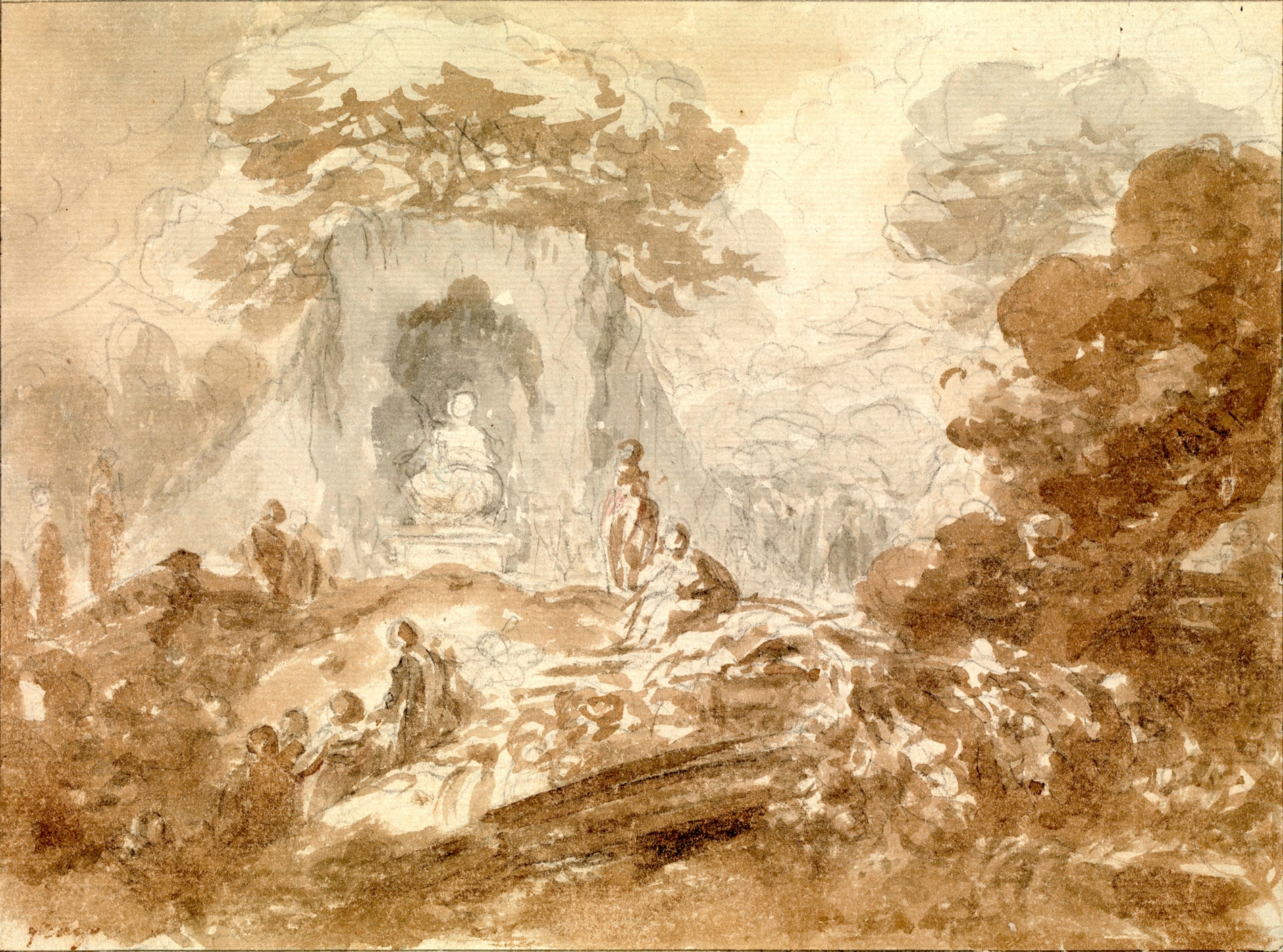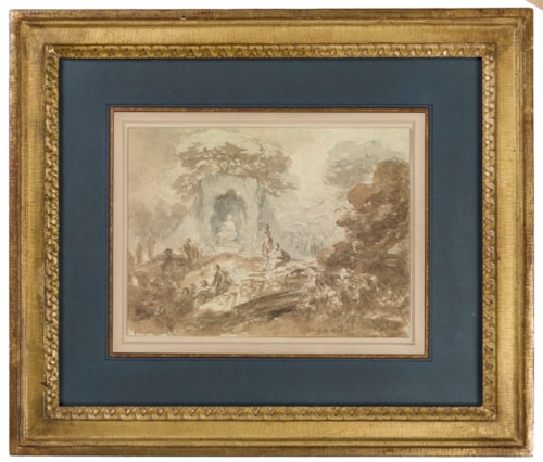 Drawn with incredible freedom in brush and wash, this atmospheric landscape drawing is likely to have been made during or shortly after Fragonard’s summer at Tivoli in 1760. As one scholar has described the drawing, ‘The shadowy, diffuse figures in the foreground seem to be worshipping, or at least contemplating, the statue of a female figure set on a pedestal in a niche or grotto. The latter is placed at the end of a vaguely defined structure, natural or man-made, which compounds the enigmatic quality of the scene.’