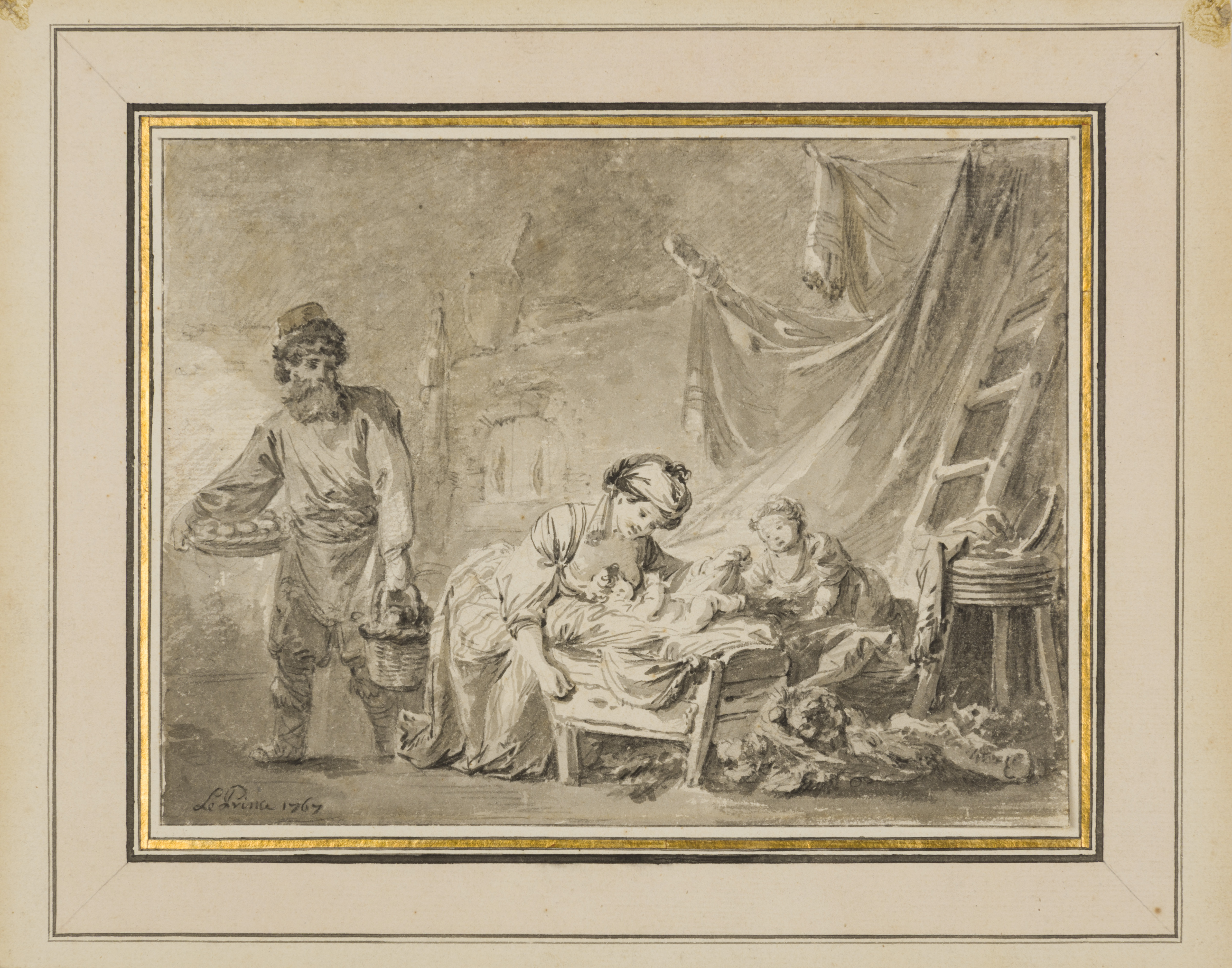Signed and dated 1767, the present sheet is a fine and charming example of the numerous genre scenes set in Russia that Jean-Baptiste Le Prince produced after his return to France. As Kimerly Rorschach has written of Le Prince, ‘the artist distilled his observations of Russia into a series of images which served him throughout his working life. Repeated in paintings, drawings, prints and tapestries, Le Prince’s images brought the exotic flavour of far-away Russia into the drawing rooms of many a fashionable Frenchman.’