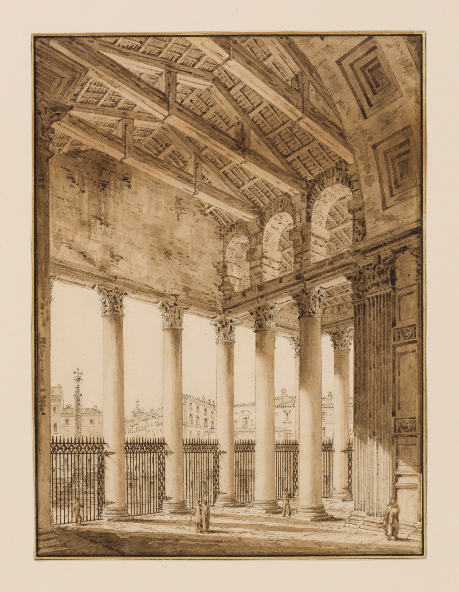 Victor-Jean Nicolle has been described as ‘a conscientious and precise draughtsman, somewhat cold but not devoid of a certain poetic power.’1He almost never dated his drawings, so a chronology of his oeuvre as a draughtsman is difficult to establish. Nevertheless, the present sheet may be approximately dated to the artist’s second period in Rome, between 1806 and 1811. Nicolle treated the subject of the Pantheon in Rome several times, although usually with the ancient building viewed from the front, with the Piazza della Rotonda in the foreground, as seen in an oval watercolour in the National Gallery of Art in Washington D.C. and another in the Musée des Beaux-Arts in Rouen.