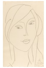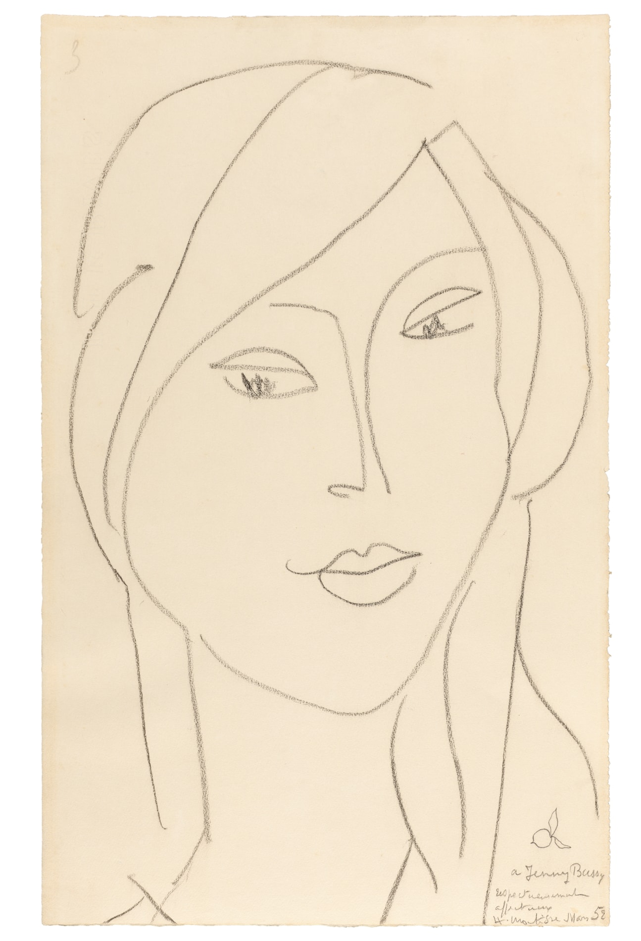 Drawn in 1950 and presented to the sitter two years later, this portrait drawing depicts Janie Bussy, the daughter of one of Matisse’s oldest and dearest friends, the artist Simon Bussy. The sitter, Jane Simone Bussy (1906-1960) was the only child of Simon Bussy and Dorothy Strachey, the sister of Lytton Strachey. Her father and Matisse had been fellow students in the atelier of Gustave Moreau in the 1890s, and maintained a lifelong friendship. Living in Nice and Cimiez, Matisse was a near neighbour of the Bussy family, who lived at Roquebrune, and came weekly to visit, so that the young Janie Bussy grew up seeing much of the master. As Matisse’s biographer Hilary Spurling has noted, however, ‘Janie, positioned like her parents between England and France, grew up among some of the finest minds and keenest gossips of both countries…[she] spent much time as a teenager in the company of adults who revered Matisse...but she herself has sucked in a healthy dose of Strachey scepticism and satirical dissent with her mother’s milk.’