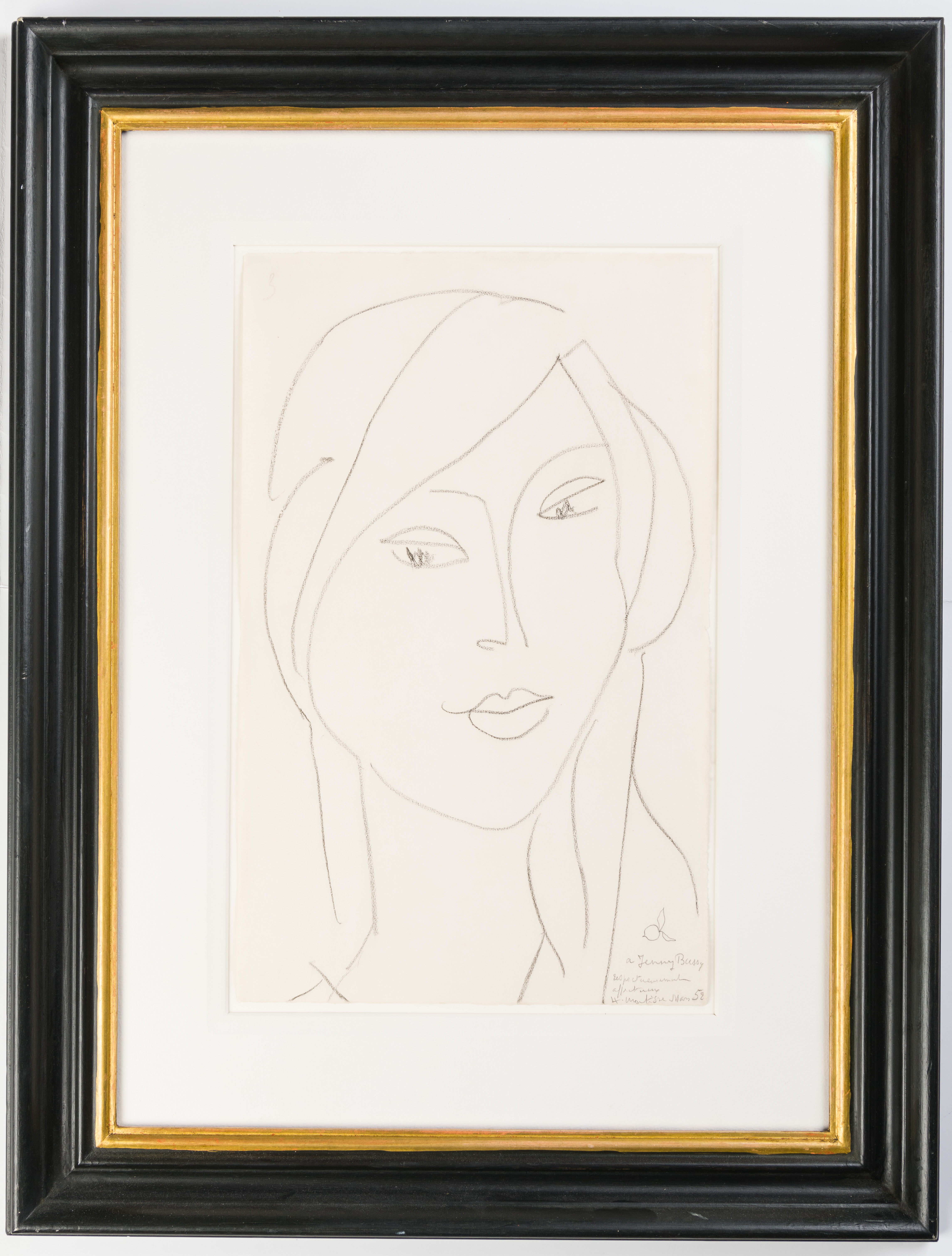Drawn in 1950 and presented to the sitter two years later, this portrait drawing depicts Janie Bussy, the daughter of one of Matisse’s oldest and dearest friends, the artist Simon Bussy. The sitter, Jane Simone Bussy (1906-1960) was the only child of Simon Bussy and Dorothy Strachey, the sister of Lytton Strachey. Her father and Matisse had been fellow students in the atelier of Gustave Moreau in the 1890s, and maintained a lifelong friendship. Living in Nice and Cimiez, Matisse was a near neighbour of the Bussy family, who lived at Roquebrune, and came weekly to visit, so that the young Janie Bussy grew up seeing much of the master. As Matisse’s biographer Hilary Spurling has noted, however, ‘Janie, positioned like her parents between England and France, grew up among some of the finest minds and keenest gossips of both countries…[she] spent much time as a teenager in the company of adults who revered Matisse...but she herself has sucked in a healthy dose of Strachey scepticism and satirical dissent with her mother’s milk.’