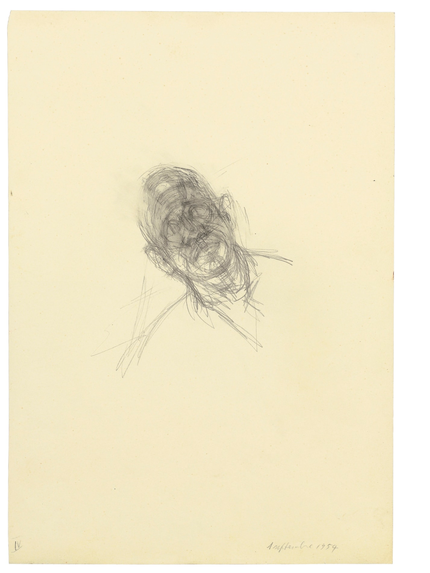 Three closely-related pencil studies by Giacometti of the head of Genet are known, two of which are, like the present sheet, dated 1 September 1954; one of these drawings is today in the Eberhard Kornfeld collection in Bern. All of these drawings are somewhat unusual among the artist’s portrait studies in that the sitter is not seen frontally, but instead with his head tilted to one side; evidence that Giacometti was particularly fascinated with the shape and structure of Genet’s bald skull. Two further portrait drawings of Genet, showing the writer seated in the artist’s studio, are dated 1957, while a pencil sketch of the writer also appears in a small sketchbook in the collection of the Fondation Giacometti in Paris.