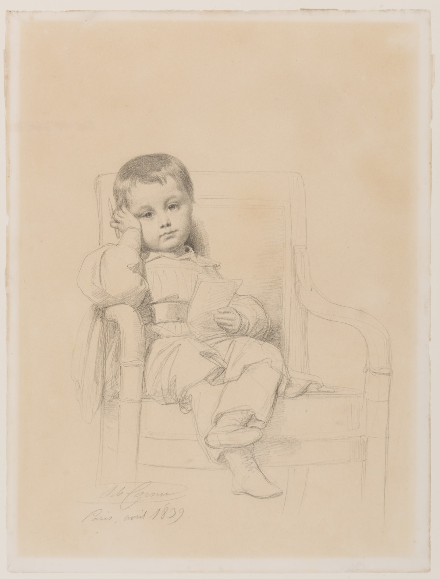 An inscription on the reverse of the frame identifies the present sheet as a portrait of the young Leon Grujon Le Bas (1834-1907) at the age of five. The son of the scholar and archaeologist Philippe Le Bas and the grandson of the French revolutionary Philippe-François-Joseph Le Bas and his wife Elisabeth Duplay, the daughter of Robespierre’s landlord in Paris, Leon Grujon Le Bas became the director of the Salpêtrière hospital in Paris and was also made a chevalier of the Legion of Honour.