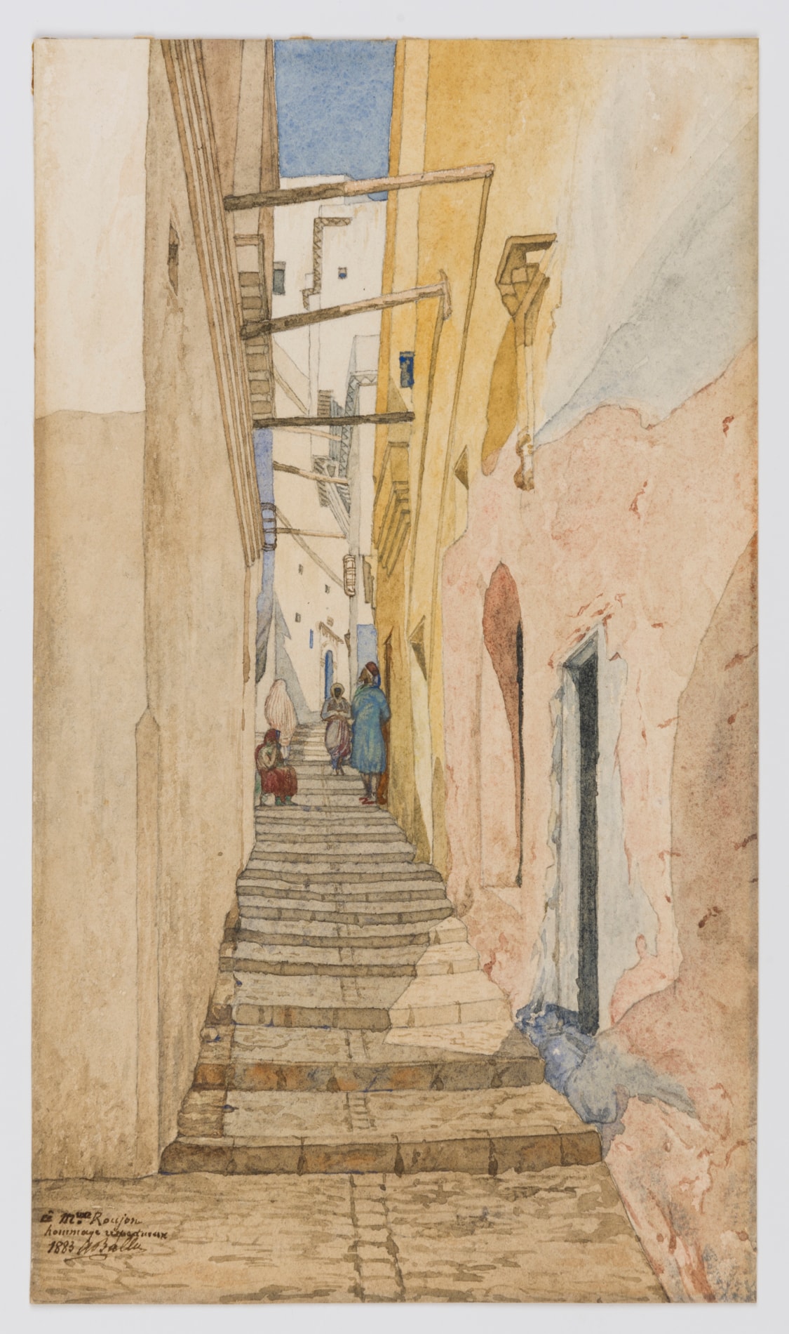 The vast majority of Albert Ballu’s known drawings are of an architectural or scientific nature, such as can be seen in the more than twenty drawings and watercolours by the artist in the collection of the Musée d’Orsay. The present sheet, a colourful scene from daily life in Algiers, showcases a different aspect of the artist’s oeuvre.