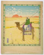 Inscribed (by Sewell) 'Unpublished ill. to How the Camel Unbent, Chapter 4 of / TheArmfield’s Animal Book, p.43, 1922. / Published ill. is pink sky with five stars + crescent moon, horizon level with / camel’s knees, and [?] border: rider has green cloak with black circles in / white rings.' on the old mount.