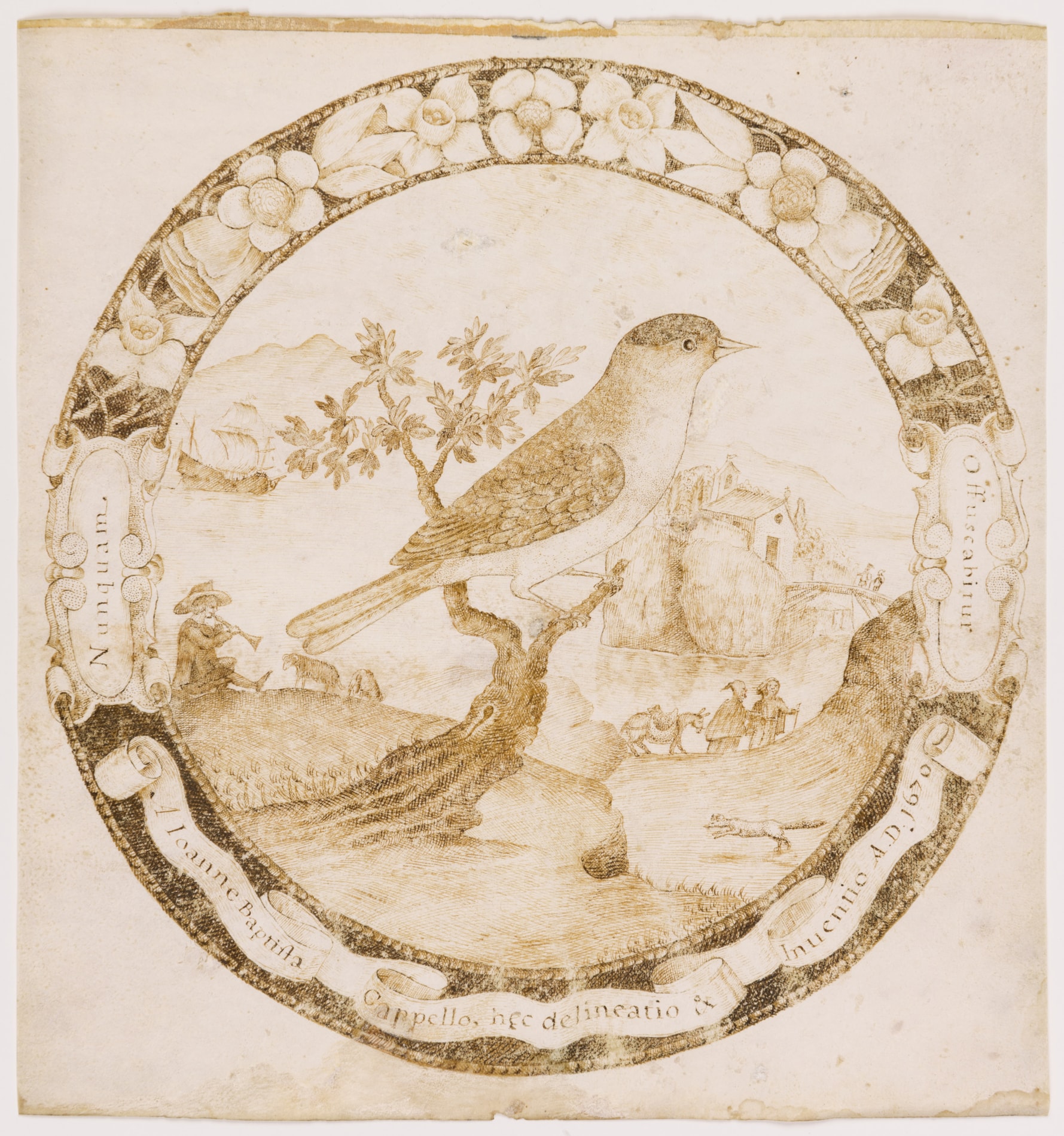 The Latin inscriptions in the cartouches at the left and right sides of the circular frame can be roughly translated to ‘never darken.’ ('Nunquam' means never, and 'Offuscabitur' is likely derived from obfuscation, which means to darken.) The bird could be a nightingale or an ortolan; a variety of finch common to Europe. Both are songbirds, the symbolic message of the present sheet encourages its viewer to never quiet or darken their song.