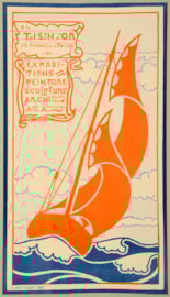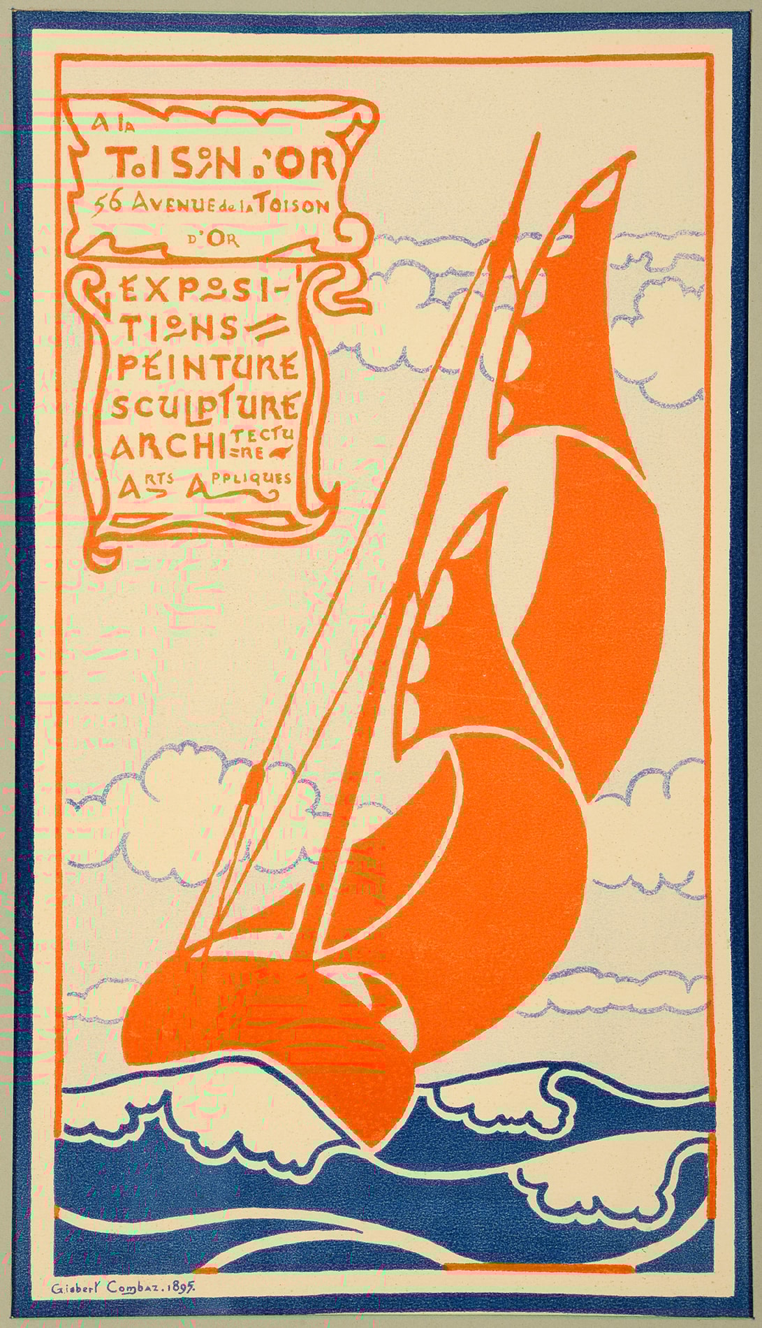 In 1895 the young Combaz received a commission to create a new poster for a new gallery, La Maison d’art, at 56, Avenue de la Toison d’Or in Brussels. As Jane Block writes, ‘Combaz, taking inspiration from the gallery’s location on the Avenue de la Toison d’or (“the Golden Fleece”), depicted the sea-faring Argo, the ship carrying Jason and the Argonauts on their quest for the golden fleece, sailing into the distance...By suppressing this text while increasing the abstract qualities of the final poster, Combaz heightened the graphic intensity. The decorative pattern of the double concave orange sails plays against the convex crest of the waves. The interrupted orange inner border at the lower right corner and lower left side adds a sense of kinetic energy which resonates in the billowy sails, movement of the waves, and even the sinuous curves holding the text. The result is a quintessential example of the new poster art, expressing its message with a remarkable economy of means.’
