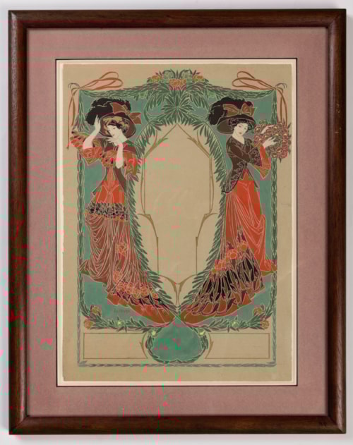 Like such contemporaries as Alphonse Mucha and Eugène Grasset, Georges de Feure was equally adept in the field of applied or decorative arts. Aptly described by one modern scholar as ‘the most art nouveau of all the Symbolists’, De Feure embarked on an association with the Art Nouveau pioneer Siegfried Bing that was to establish his reputation. He decorated the facade and designed two suites of furniture for Bing’s Pavillon de l’Art Nouveau at the great Exposition Universelle of 1900, a project that earned extravagant praise from critics, and thereafter worked closely with Bing as an artiste-décorateur, providing numerous designs for furniture, stained glass, wallpaper, ceramics and lamps. In 1903 a large exhibition of his decorative work for Bing’s Galerie de l’Art Nouveau was held in Paris, later travelling to The Hague and Hamburg. De Feure also established his own atelier, which handled commissions from other sources, such as Julius Meier-Graefe’s gallery La Maison Moderne. He continued to work as a designer and interior decorator after Bing’s death in 1905, and also undertook a number of commissions for scenery and costume designs for the stage. Among his significant later projects was the decoration of the Parisian studio of the couturier Madeleine Vionnet in 1922, and interiors and pavilions for various expositions. Late in his career De Feure was appointed Professor of Decorative Art at the École des Beaux-Arts in Paris.