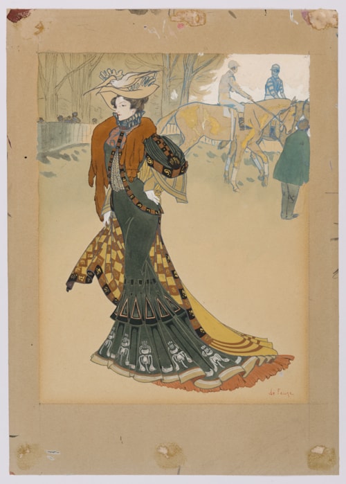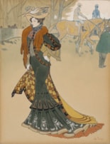 Georges de Feure was known to be a habitué of the racecourses at Longchamp and Chantilly. A close stylistic comparison may be made with another gouache drawing of a woman at a race meeting of the same year, in a private collection.
