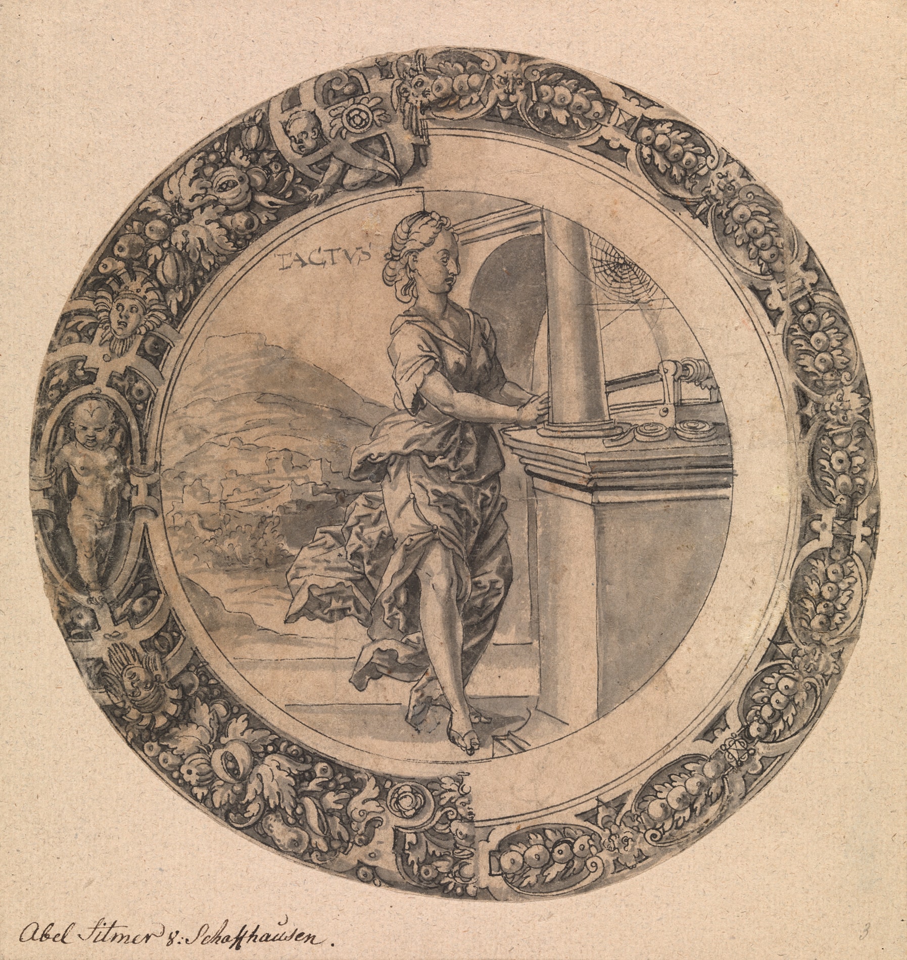 Abel Stimmer’s manner of drawing was indebted to the example of his elder brother Tobias. Exhibited in Schaffhausen in 1936, the present sheet is likely to be a design for a roundel of stained-glass, although it may also have been used as a model for a piece of silverware, such as a plate.