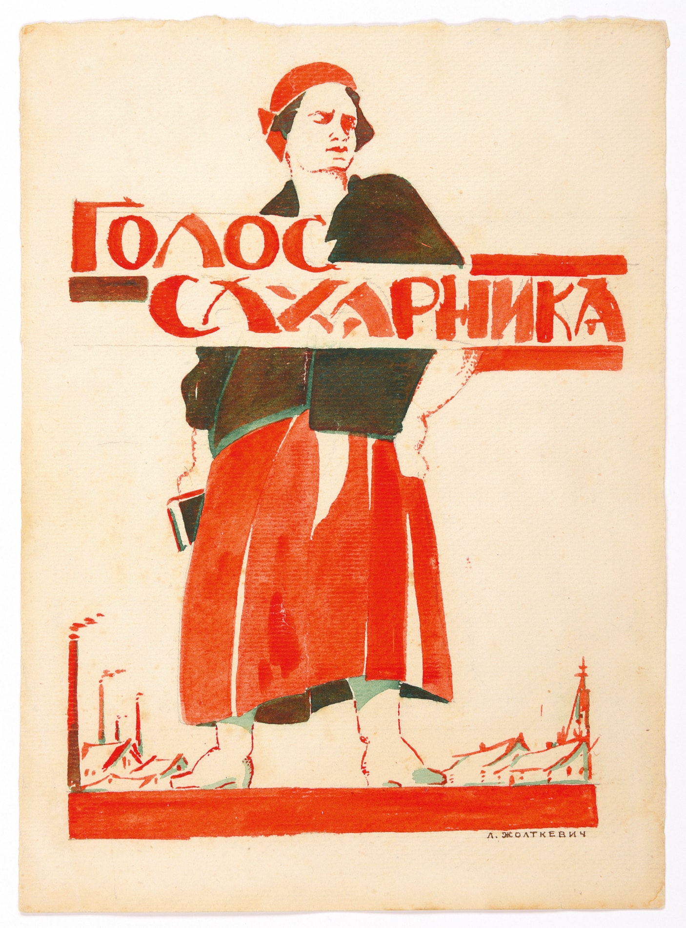 Adapting the visual language of the revolutionary movement of the 1920s, the present sheet - drawn with two bold colours of black and red, highlighted by a striking teal - depicts a female factory worker, with the prominent text translating as ‘Voice of the Sugar Factory Worker’. She is presented in a monumental stance, and wears the red headscarf of a supporter of Socialism. The image most likely refers to a telegram sent in September 1917 by the workers of the Georgievsky Company Sugar Factory in Petrograd (today Saint Petersburg) to the Russian Provisional Government in the city, condemning the possibility of a corrupt military dictatorship while underscoring the workers’ stance as worthy and principled Socialists. In the telegram, the workers of the Georgievsky Company Sugar Factory declared their full support of the Government: ‘we have utter confidence that only a unitary power in the person of the Provisional Government can save the homeland and the gains of the revolution, and that it will not allow a return to the past and thus assured we continue each in his own place to work calmly and with full energy for the good of the homeland.’