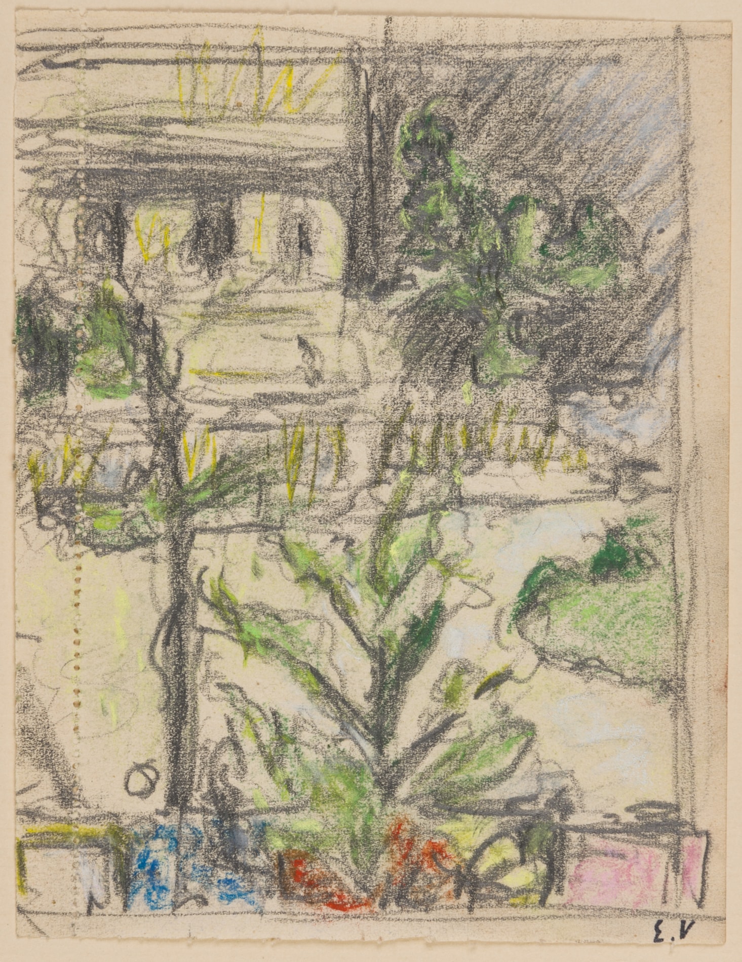 This page from a small sketchbook is a preparatory study for a square-format painting of the Place Vintimille, of modest dimensions, which is currently on the art market. Both the drawing and the painting can be dated fairly precisely to the period between late October and the middle of November 1919, as each work depicts, at the bottom of the composition, several colourful election posters attached to the railings of the park, in advance of the legislative elections held on the 16th of November 1919. Indeed, the painting is mentioned in Vuillard’s journal on the 30th of October and the 2nd of November 1919.