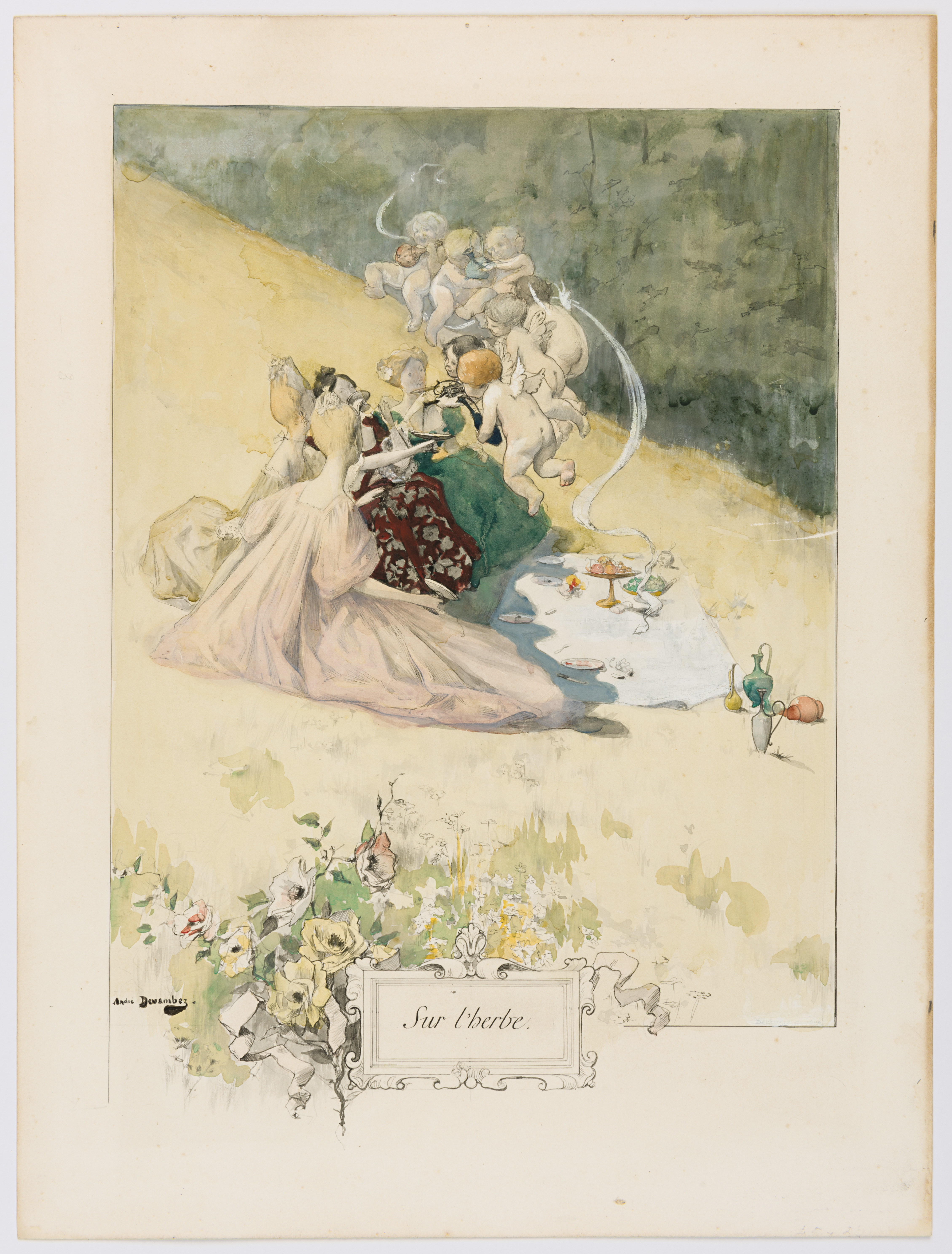 Reminiscent of the fêtes galantes of the 18th century, a genre made popular by Watteau, the composition of this drawing is similar to that of a circular painting by Devambez, also entitled Sur l’herbe, exhibited at the Salon of 1900.