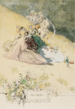 Depicting a group of young women enjoying goblets of wine served by frolicking, hovering putti, the present sheet is typical of André Devambez’s delightful and often enchanting compositions. It has been suggested that this drawing is a design for a menu for the famed Parisian restaurant Maxim’s, for which the artist is known to have drawn an illustration - with the title 'Sur l’herbe' - for the cover of the wine list of Côtes du Rhône.