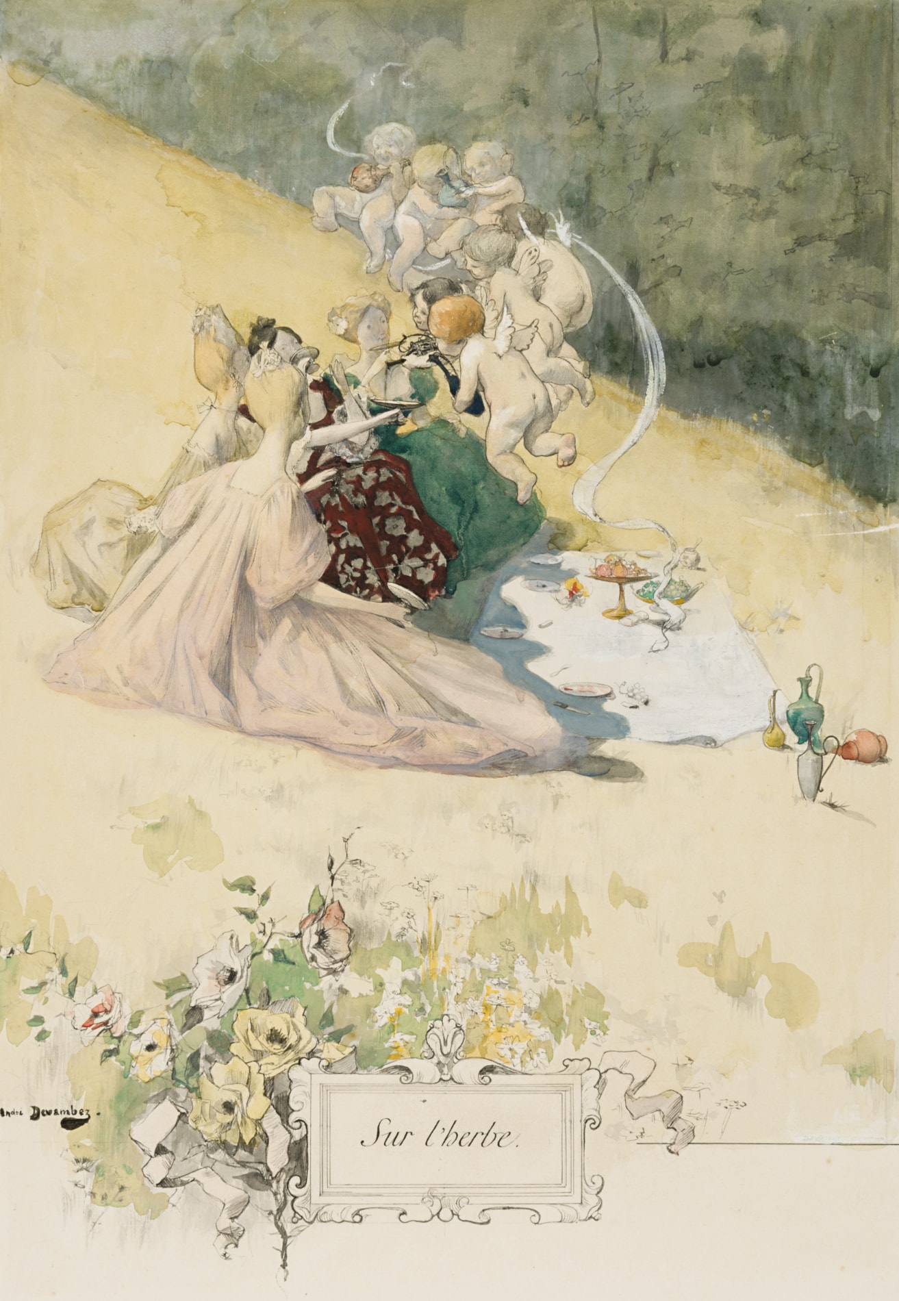 Reminiscent of the fêtes galantes of the 18th century, a genre made popular by Watteau, the composition of this drawing is similar to that of a circular painting by Devambez, also entitled Sur l’herbe, exhibited at the Salon of 1900.